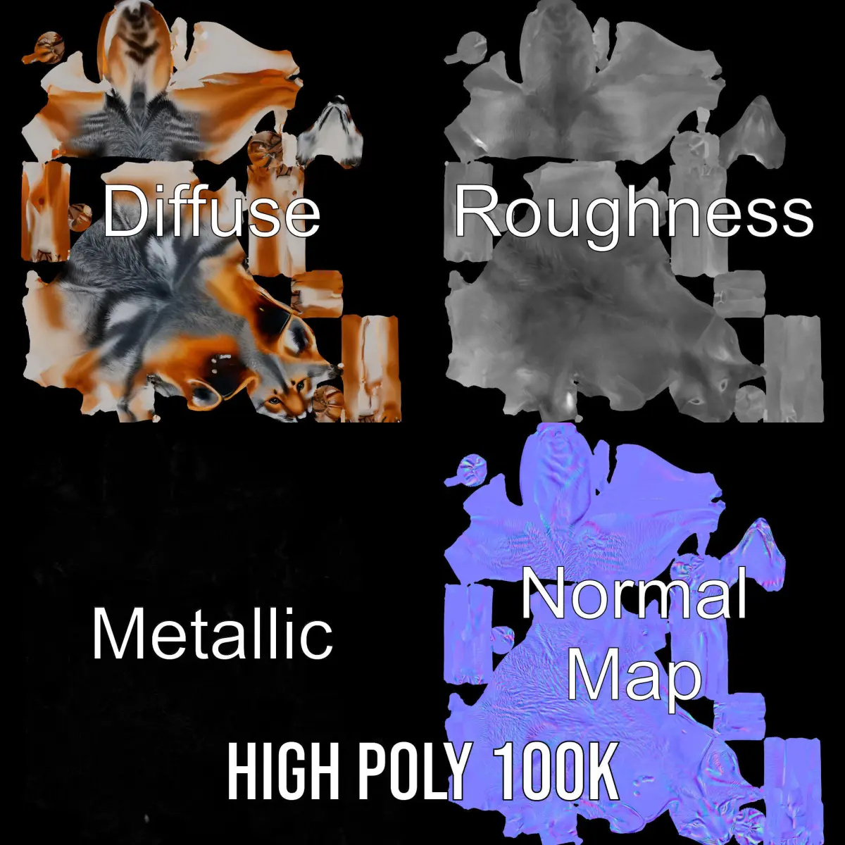 The fox model pack features detailed and realistic 3D models of a fox, ideal for use in games, films, and animations. The pack includes three levels of detail: low-poly for mobile applications, middle-poly for environment setups, and high-poly for production rendering. This flexibility allows for seamless integration into various platforms using the LOD System principle. The fox model's textures are fully PBR with Diffuse, NormalMap, and reflection/roughness/metallic maps, ensuring compatibility with modern rendering engines. All textures are 4096x4096, and each model is accurately unwrapped with no overlapping UVs, enhancing quality and realism. The first image is the reference used for creating the 3D model. It is important to carefully evaluate the quality of the model by examining the preview images that display the topology and polygonal mesh. These previews (WIRE and WEB 3D Preview) clearly demonstrate how accurately the model matches the original reference and how well the geometry has been executed. This model is perfect for a variety of settings, such as wildlife simulations, educational presentations, or as a character in narrative-driven projects. If you enjoy this model, please like and leave a comment!