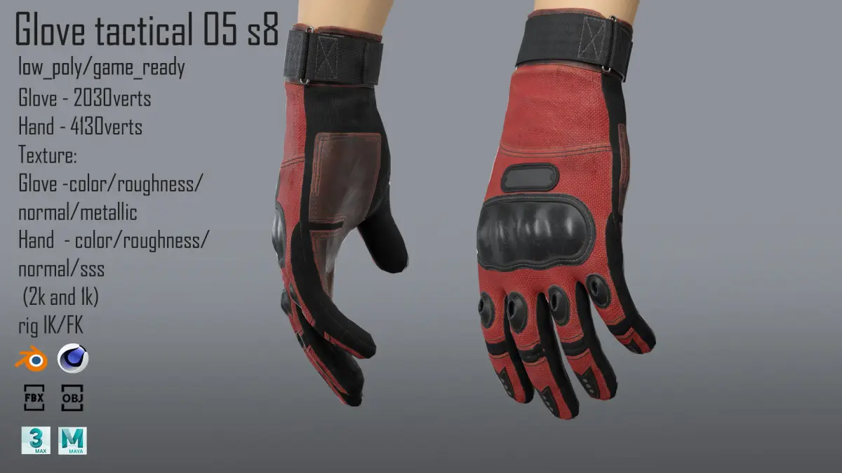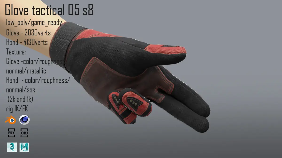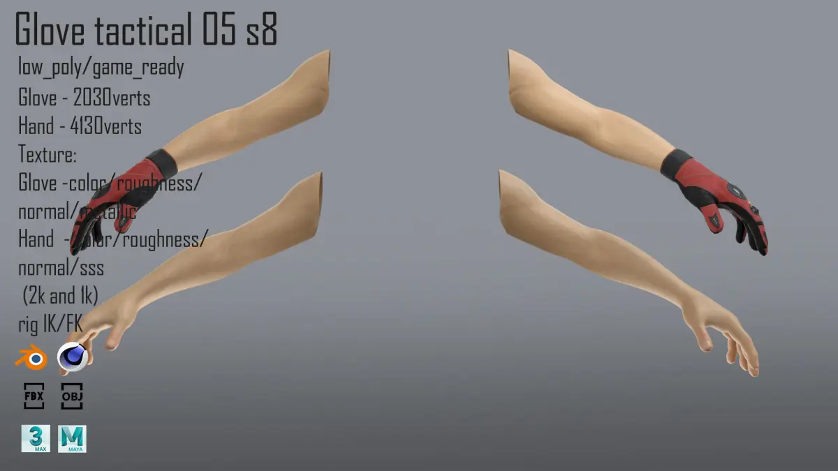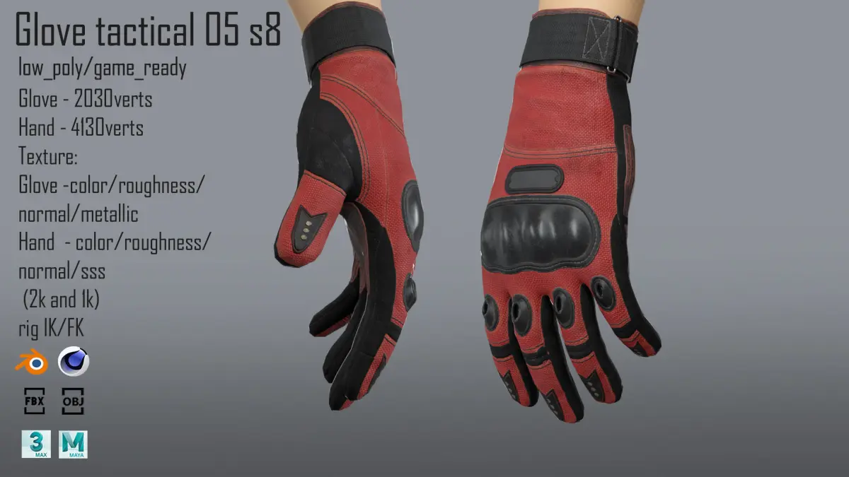 Texture: Glove -color/roughness/normal/metallic (2k and 1k) Hand - color/roughness/normal/sss (2k and 1k)