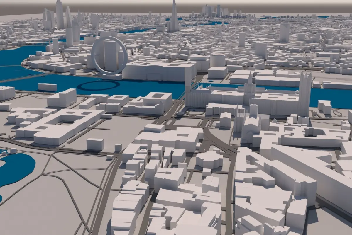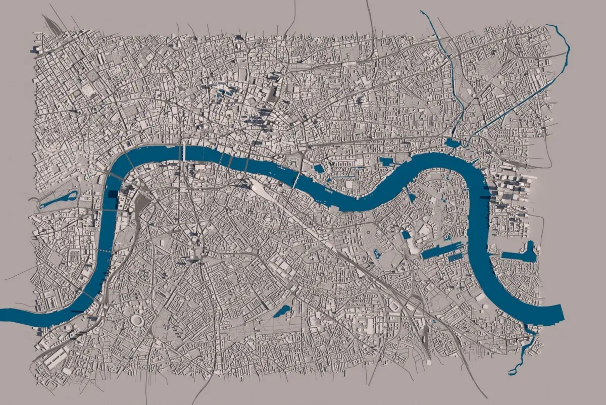 a fragment of the city of London, a 3d model in a primitive style consists of primitives, a casual style can give your video an interesting unusual style for visual solutions