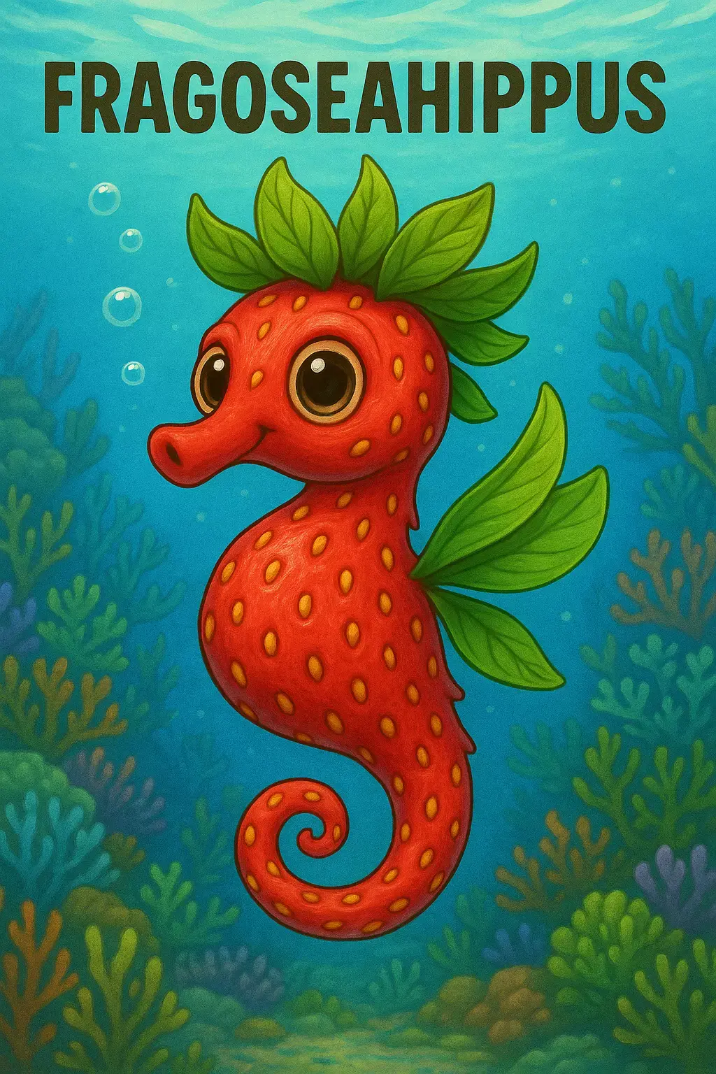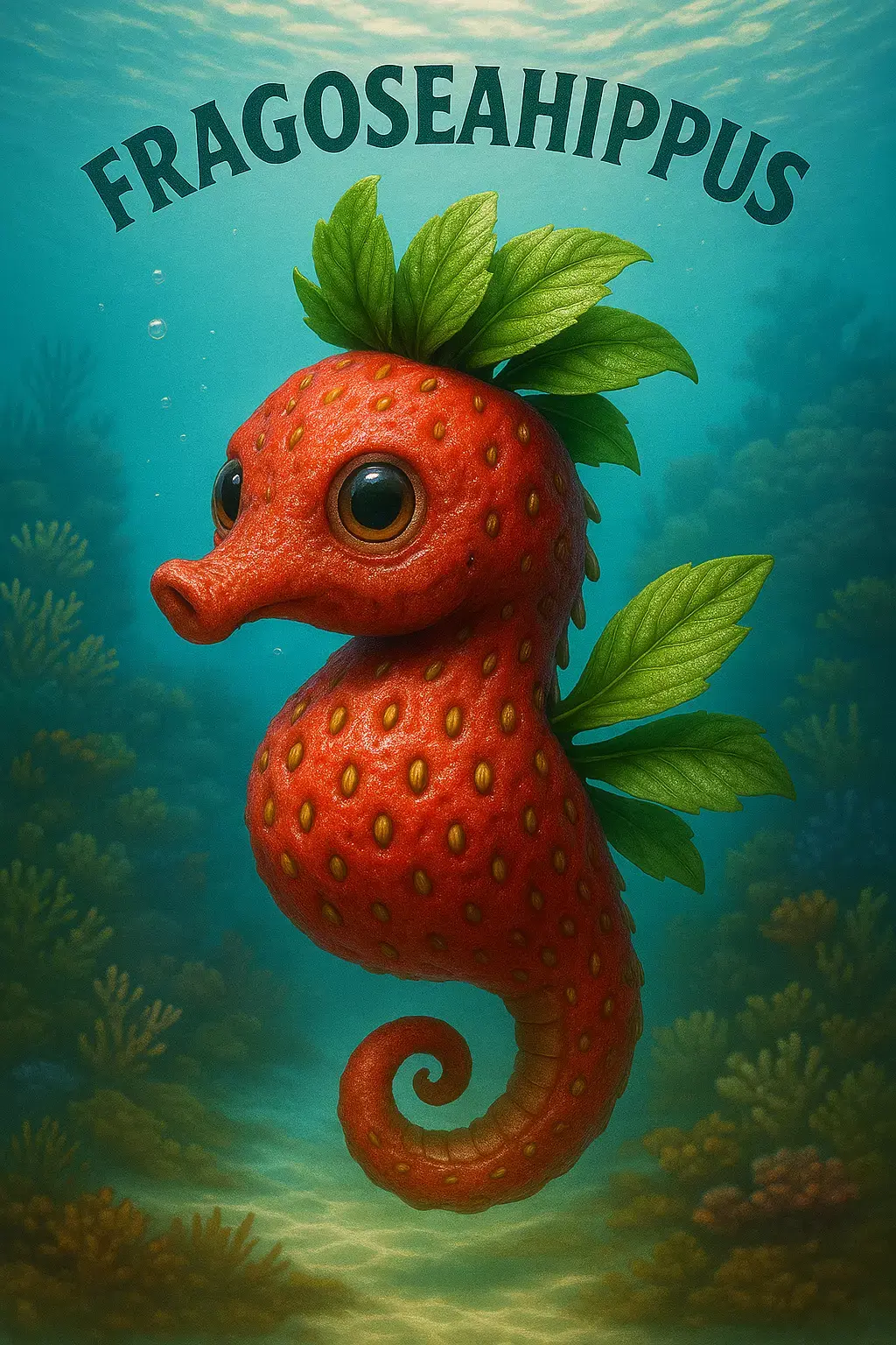 Meet Fragoseahippus, the sweetest rider of ocean currents! A mythical seahorse born from the union of marine grace and fruity freshness. Its body is covered in strawberry-like seeds, crowned with leafy fins and petals that sway like waves in the breeze.