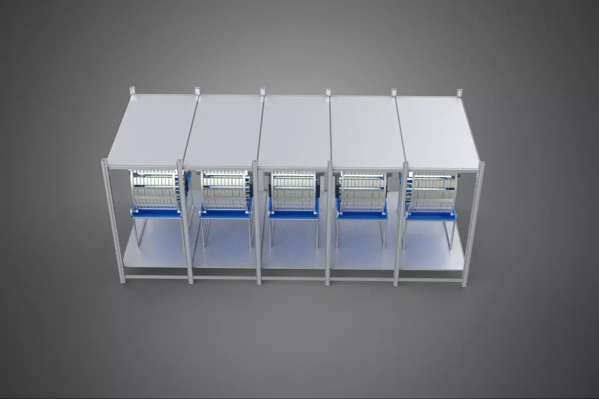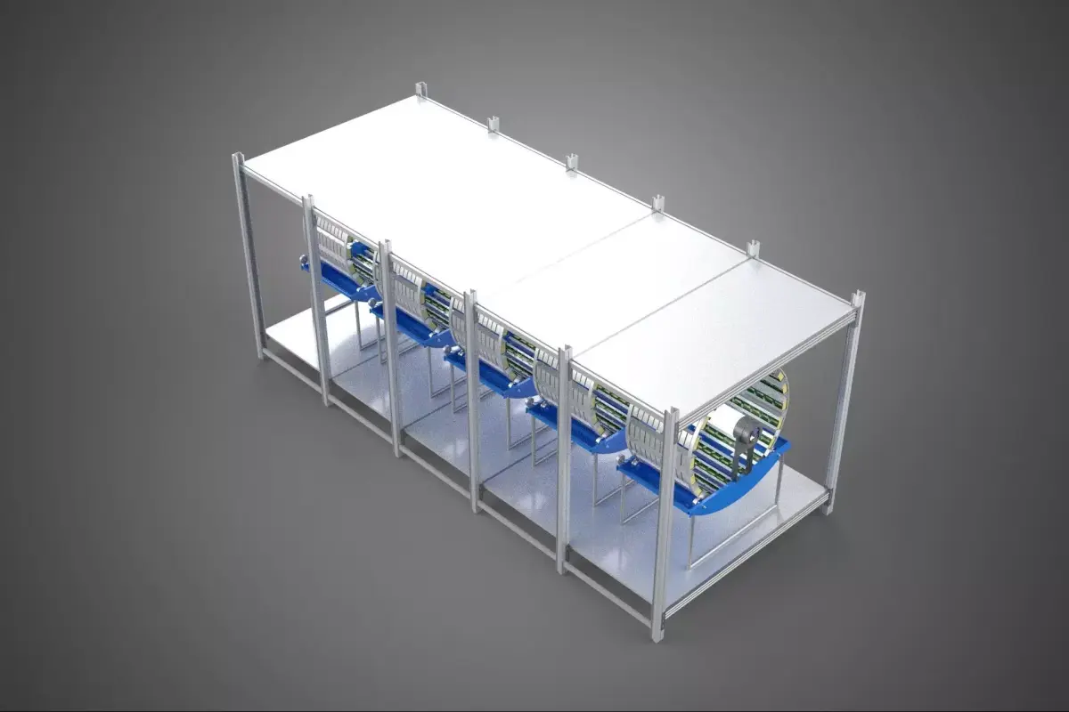 The Frame Array Row Shelf Rack component refers to the robust, multi-level structural support system. Typically constructed from durable, corrosion-resistant materials such as aluminum, stainless steel, or treated steel, this framework is engineered for stability, longevity, and often modularity, allowing for scalability and customizable configurations. Plants are cultivated within individual trays, which are precisely integrated into the shelves or racks. These trays are specifically designed to hold plant roots and nutrient solutions, facilitating easy handling, cleaning, and rotation. The systematic arrangement in rows and shelves or racks enables high-density planting and efficient utilization of vertical space, a hallmark of vertical farming methodologies.