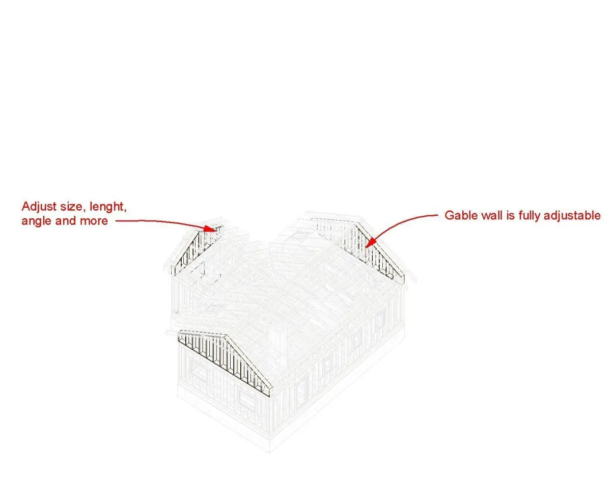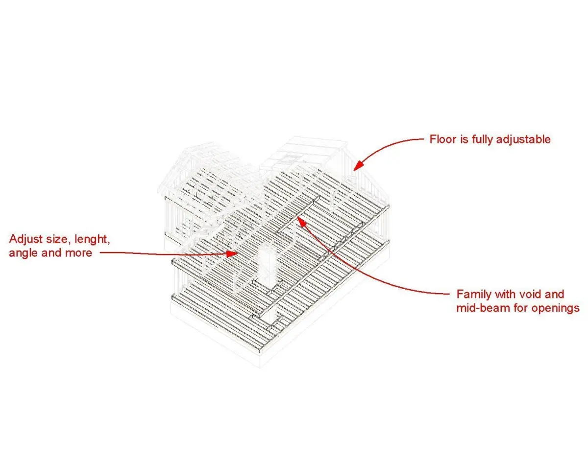 This is a fully parametric Revit model of Frame House with Rafter Roof. All aspects of the building are parametric including the height, length, offsets, angles, beams count, spacing and visibility. The structure consists of parametric roof, walls, floors, see screenshots for details.