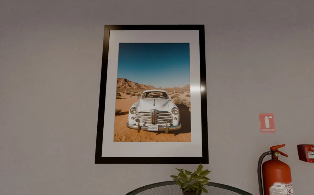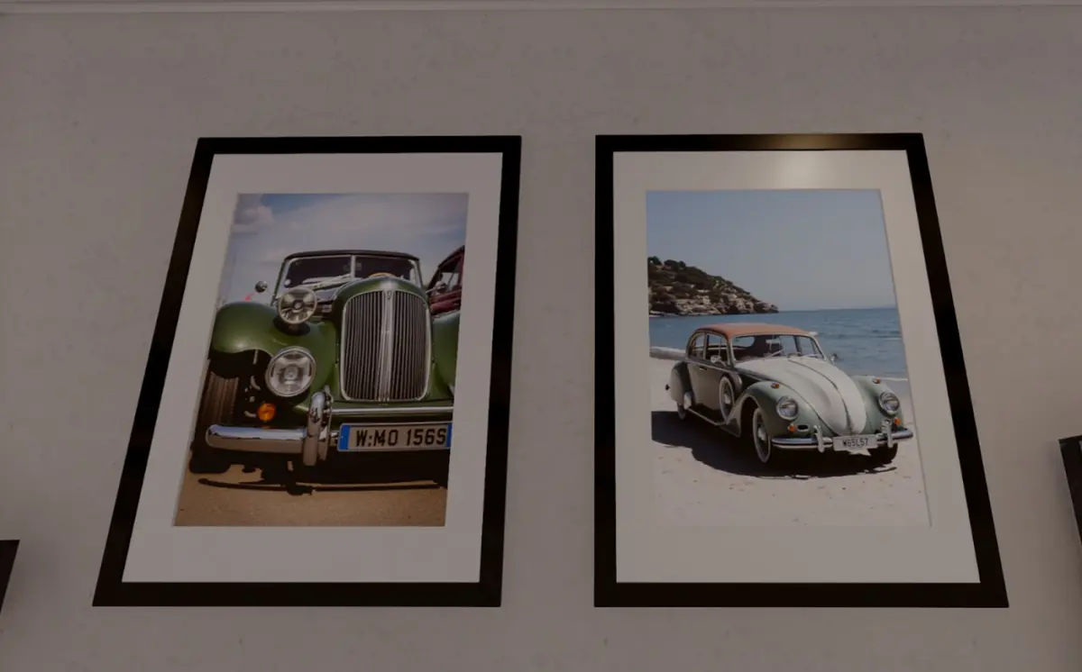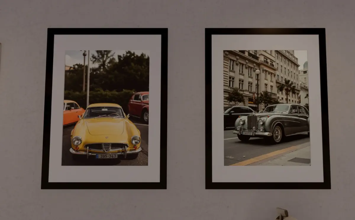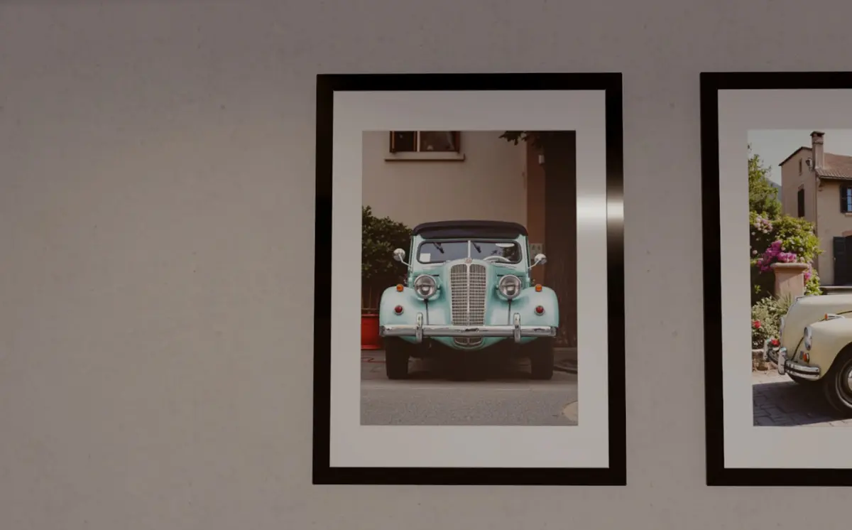 Nine classy, vintage framed photographs of old-fashioned cars in various settings.