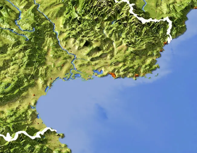 The 3D relief is taken from reprojected NASA shuttle radar topography data, with the elevation exaggerated. The relief is baked into a 750x743 mesh with 1120523 polys, 561764 vertices (for the main map).
