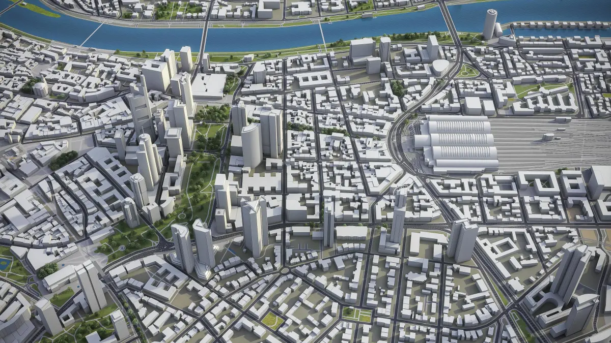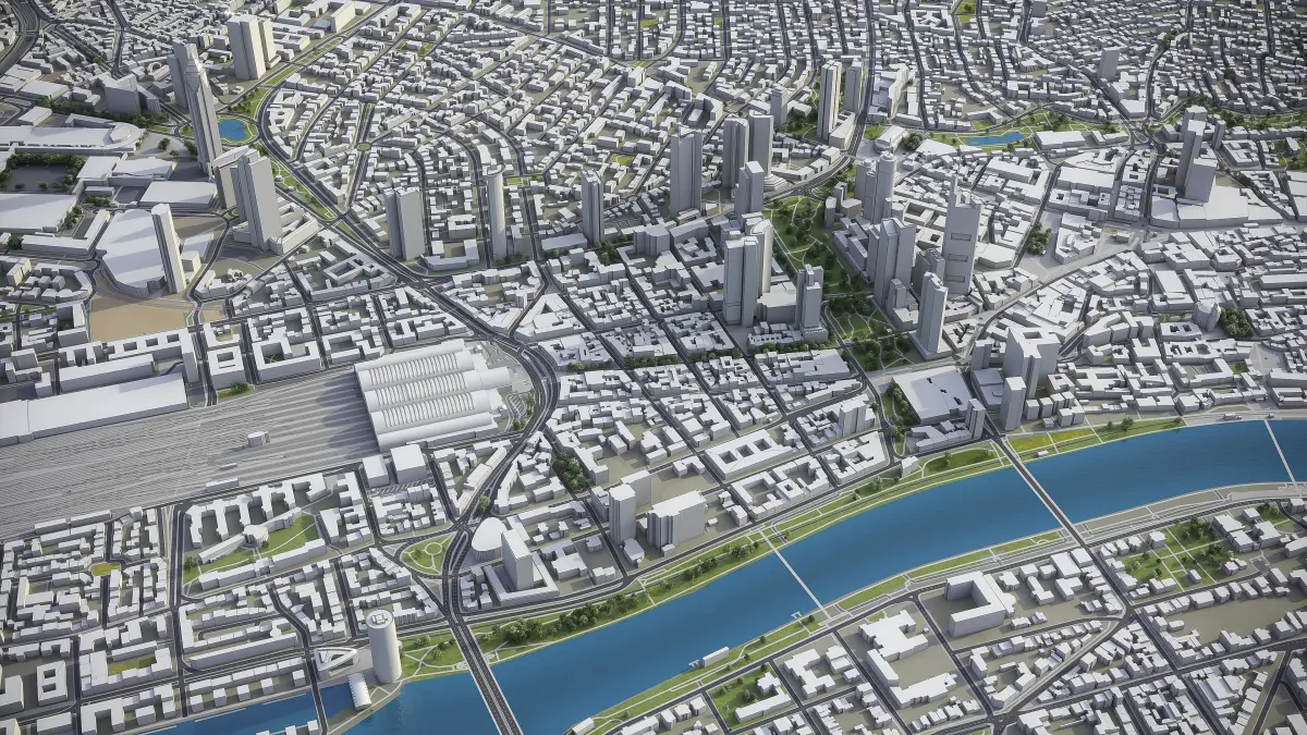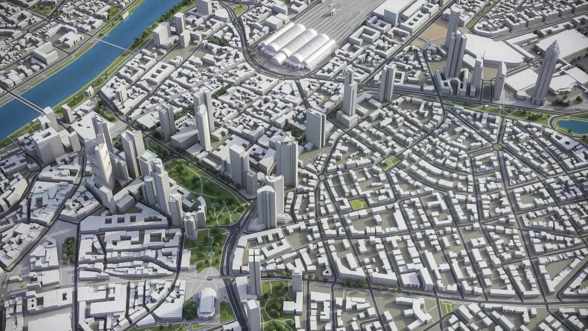 This is exact and accurate to scale 3D city model of Frankfurt Metropolitan Area and its surrounding area based on GIS data (May 2020)