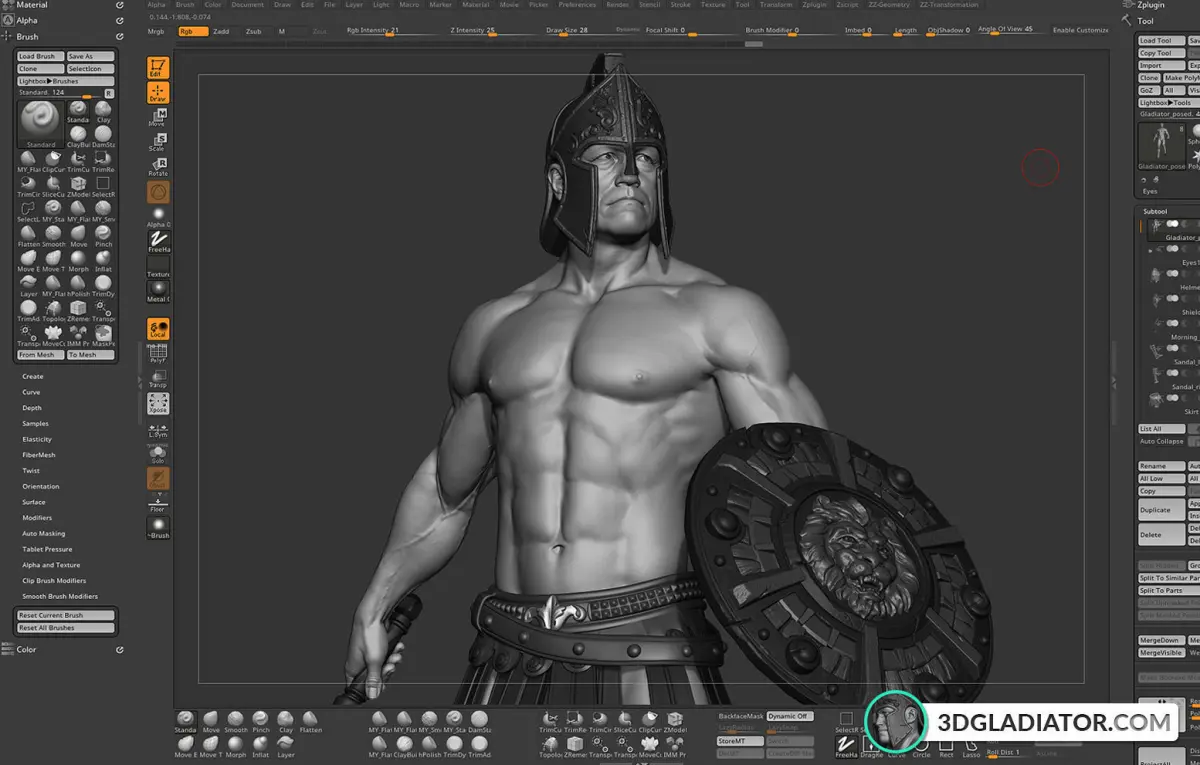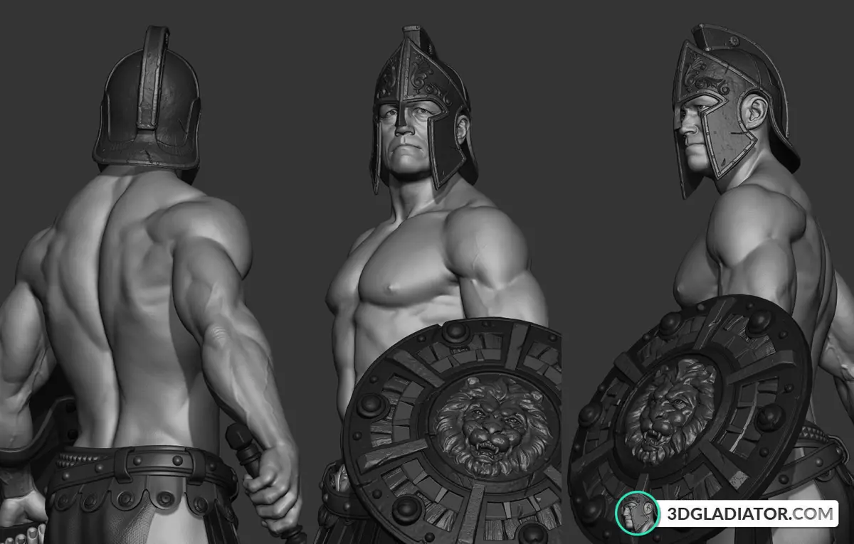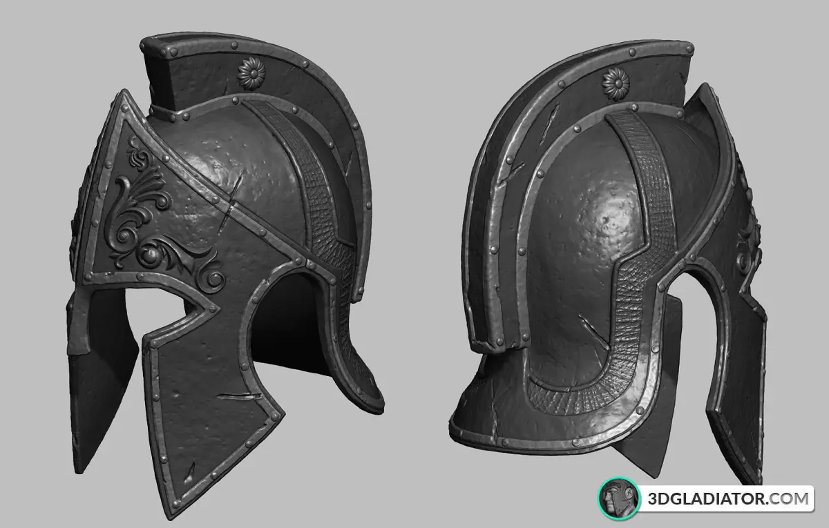 The helmet consists of 2.7 million polygons and was made in ZBrush. The package contains the original ZTL file with active polygroups and a high-res OBJ file. It is part of the 3d Gladiator Reference Model that’s available for free on 3dgladiator.com