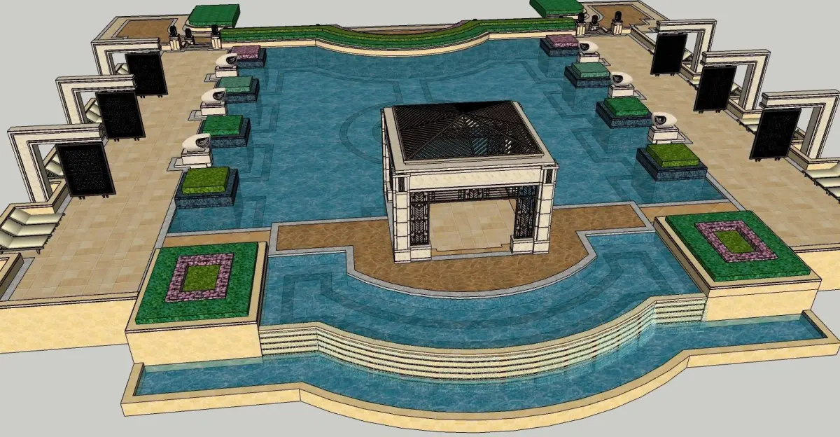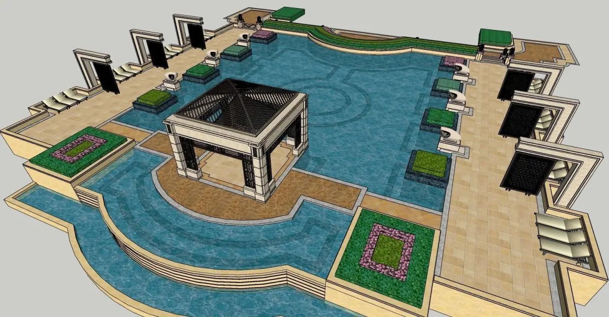 Outdoor swimming pool designs. 3D model of outdoor swimming pool with furniture, sun umbrella, lounges and potted plants.