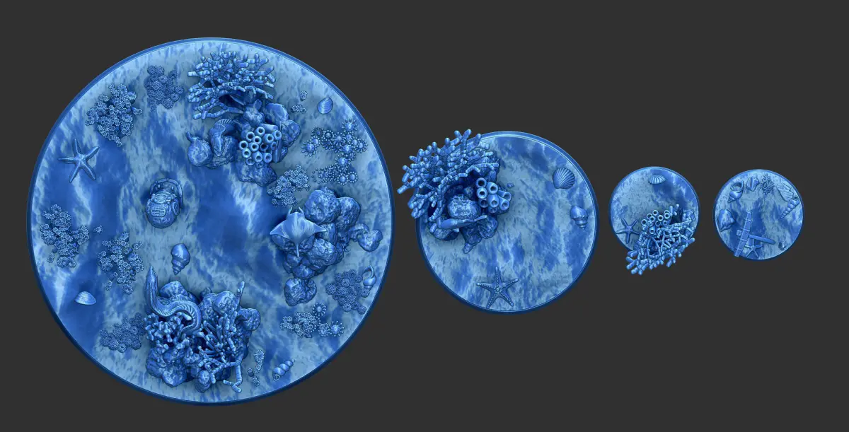 The pack includes 4 miniature bases 25, 50 and 100 mm diameter 3dprint ready, in OBJ and STL format, put into 2 folders.