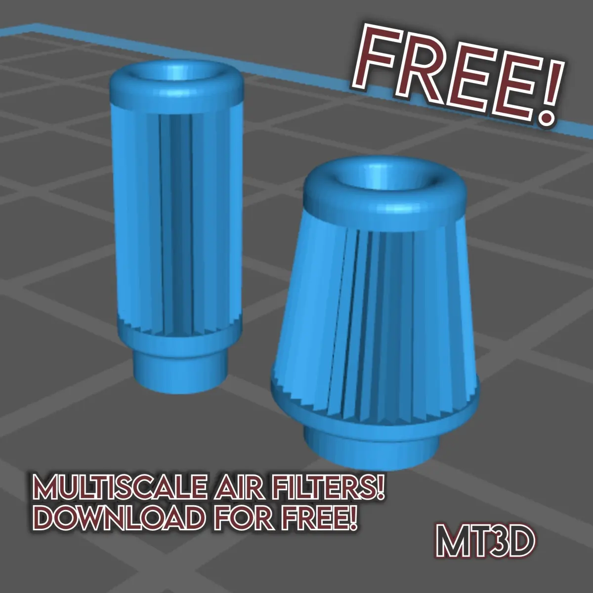 Just 2 simple air filters for you to add on your scale auto builds and dioramas!Get 'em both for free!They are in 1/1 scale, so to resize them, use the chart below:1/10: 10%1/12: 8,33%1/16: 6,25%1/18: 5,56%1/20: 5%1/24: 4,16%1/25: 4%1/32: 3,13%1/35: 2,86%1/43: 2,33%1/64: 1,56%If you like my designs, you can tip me and credit me with the design, also share photos of your makes on the internet and taggin me.If you like to sell the prints of my designs just buy them here and credit me with the design, no need to ask or pay commisions.I can do commision designs, just ask me what you need and I'll see what I can do.Just scale it up to the size you want and print with you favorite resin printer.Depending on your printer printing quality the smaller scales may lose some detailing.If you need any help, don't hesitate on contacting me.Some sanding or drilling may be needed.