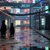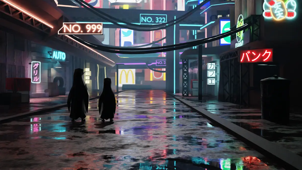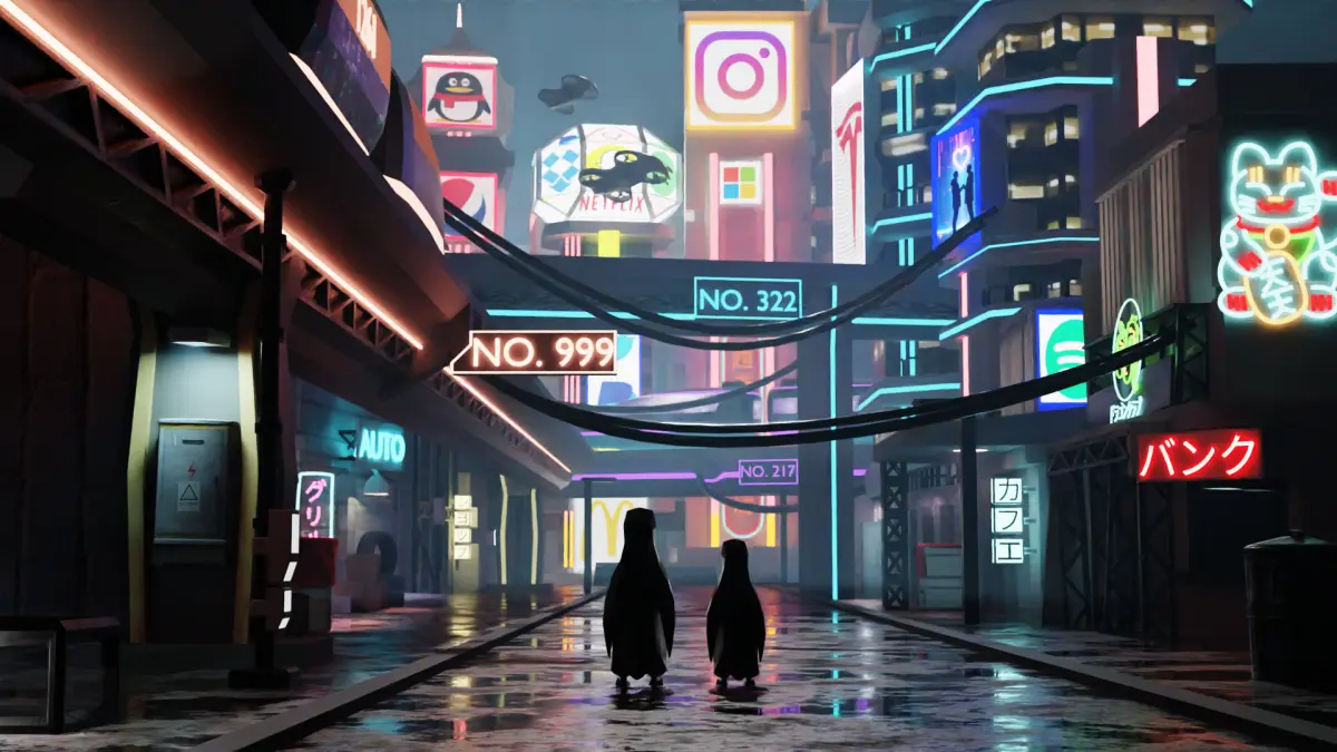 A fantastical cyberpunk city environment.
