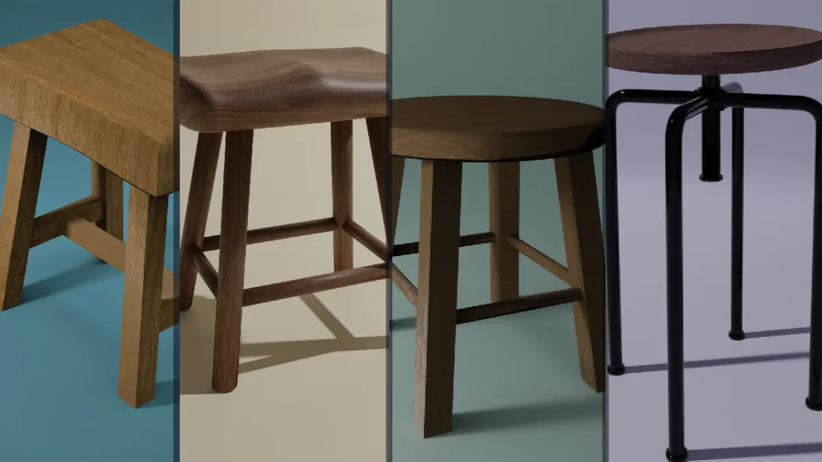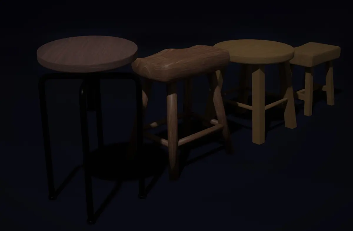 A Collection/pack of 4 stools for free. Larger collection available on profile. PBR, UV unwarped. Made on Blender. Multiple formats available in the files.