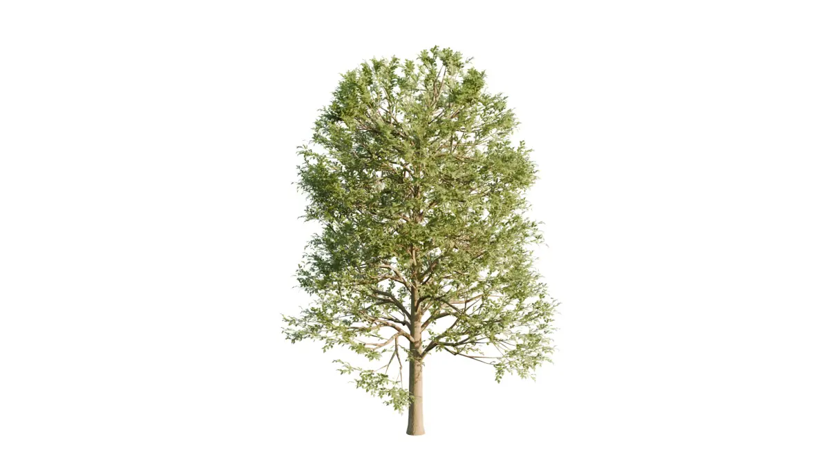 The branches extend organically from the trunk, following a natural growth pattern with varying thickness and direction. This gives the tree a dynamic silhouette, making it suitable for a variety of environmental settings. Each branch is carefully placed to support the foliage, which consists of numerous individually modeled leaves. These leaves are varied in size and slightly curled or angled, capturing the randomness seen in real trees. The leaf texture includes subtle gradients and color variations, enhancing the realism, especially in close-up shots or high-resolution renders.