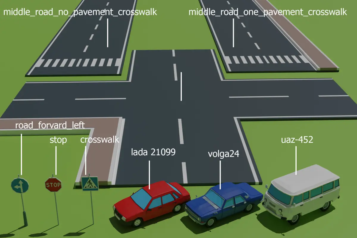 3 roads (crossroads with one curb) (long road with one curb) (long road without curbs) in the full version there are 40 elements of roads (big and small turns, small and big bus stops, small, big and average roads, roads with pedestrian crossings)