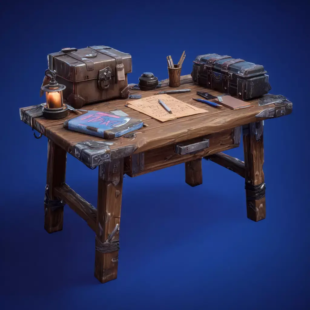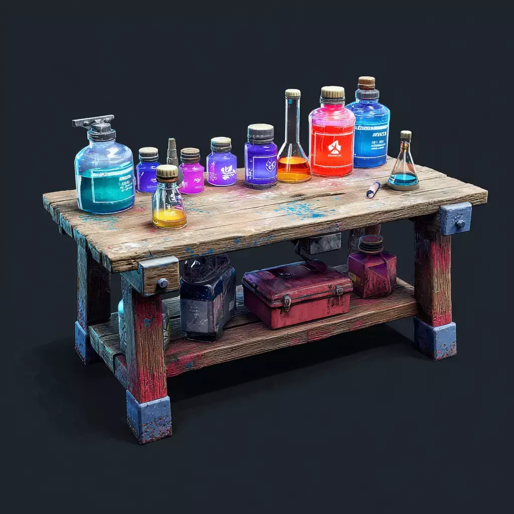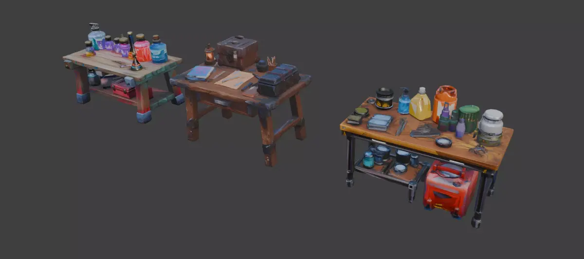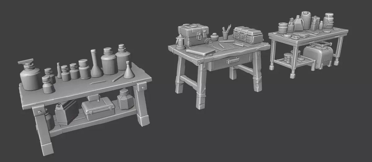 A collection of stylized workbench tables designed for workshop, crafting, and industrial environments.This pack includes multiple variations of detailed tables filled with tools, bottles, containers, and small props — perfect for adding life and storytelling to your scenes.
