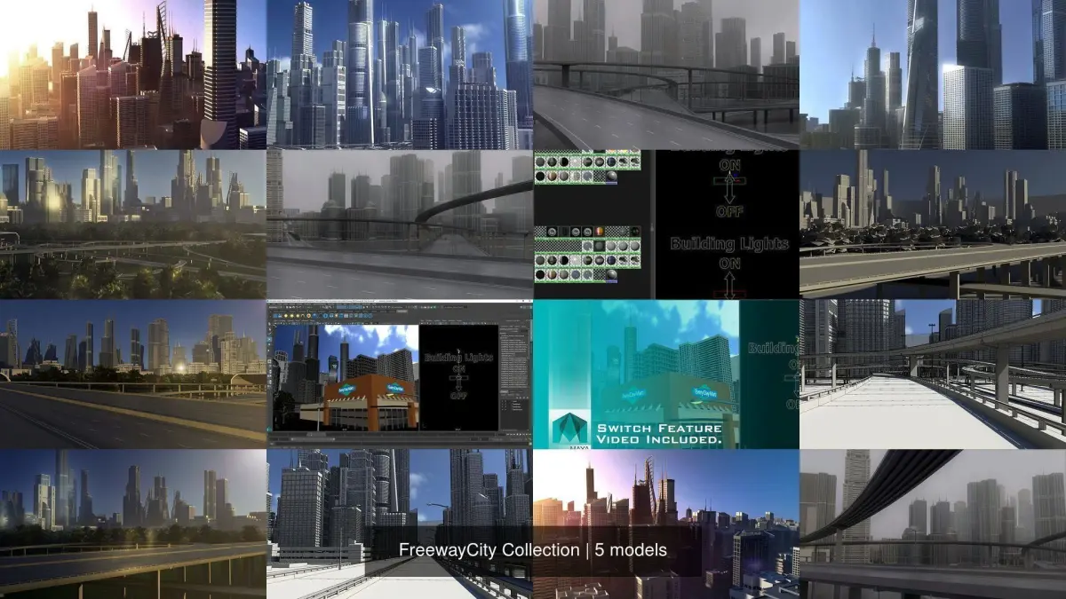 A freeway collection with a city environment with sun and sky light and HDRI rendered with mental ray with assigned shaders with textures. With built in Glow lighting in the scenes.