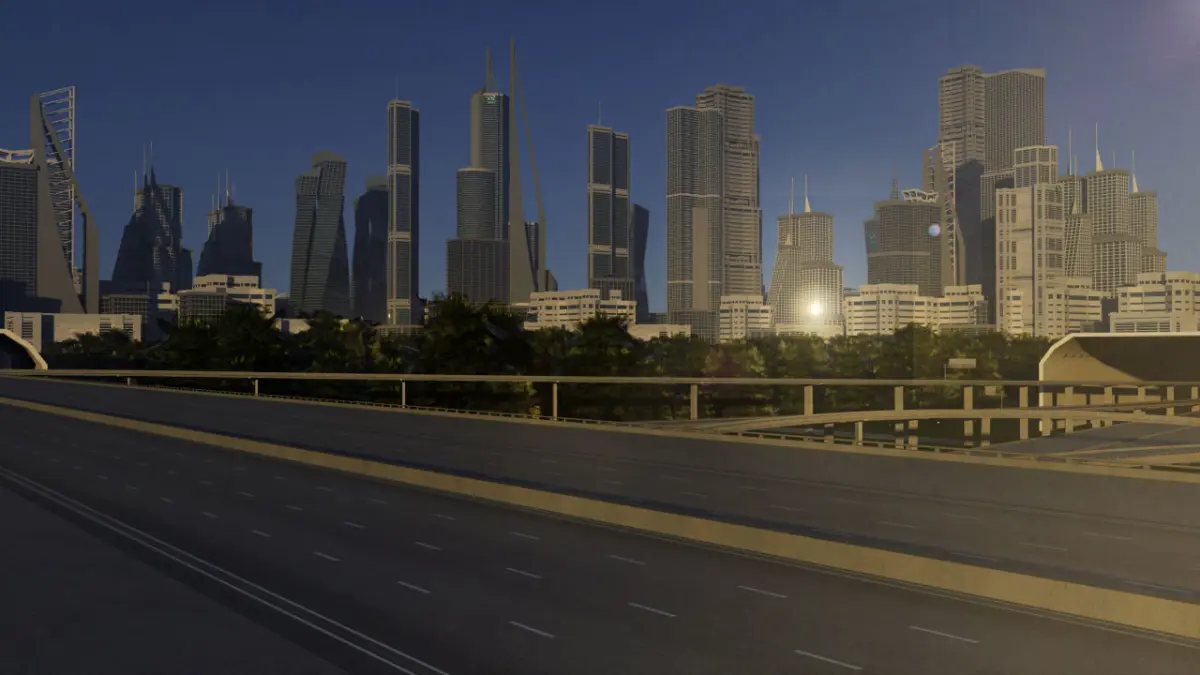 A 3D Freeway in a city environment with a sun light and 4k HDRI environment with built in glow lighting in the scene. This scene is Rendered with Mental Ray and has assigned shaders with textures.