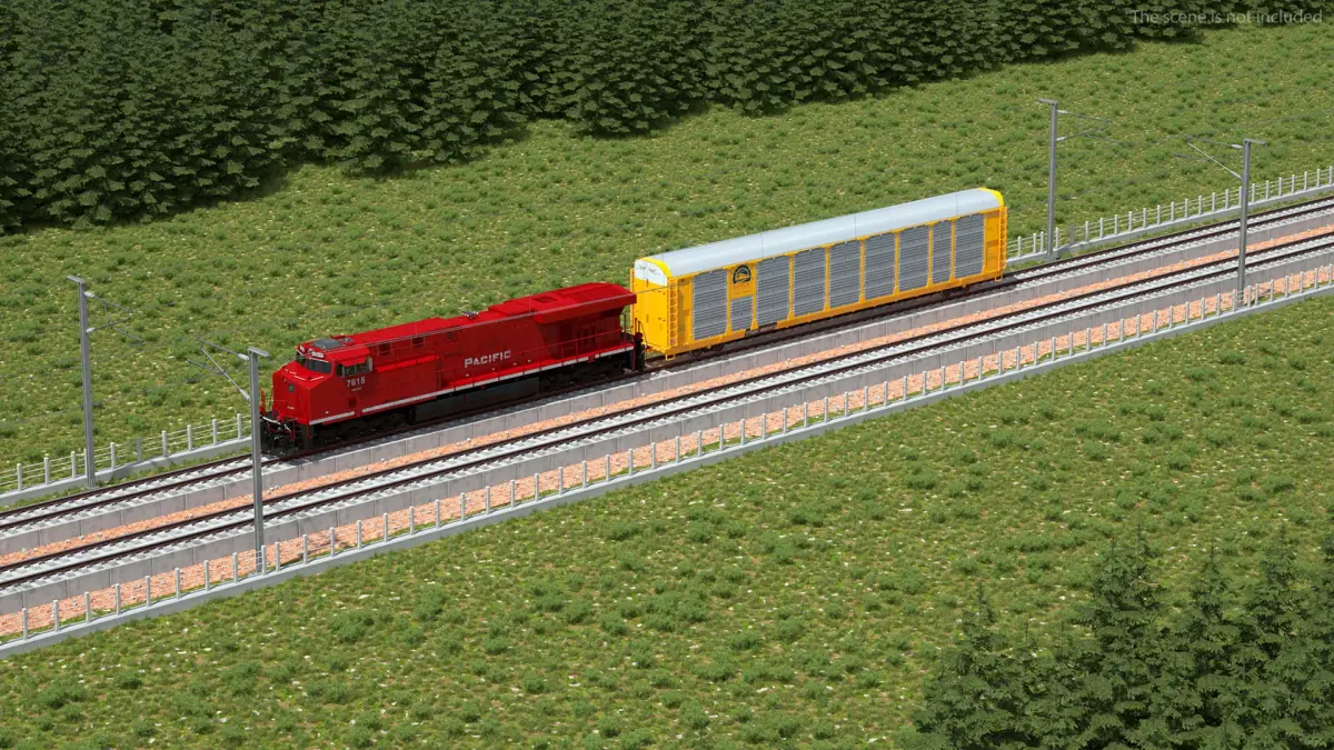 Freight Train with Autorack Train Car on Railway is a high quality, photo real 3d model that will enhance detail and realism to any of your rendering projects. The model has a fully textured, detailed design that allows for close-up renders, and was originally modeled in 3ds Max 2014 and rendered with V-Ray. Renders have no postprocessing!