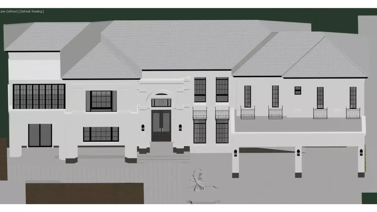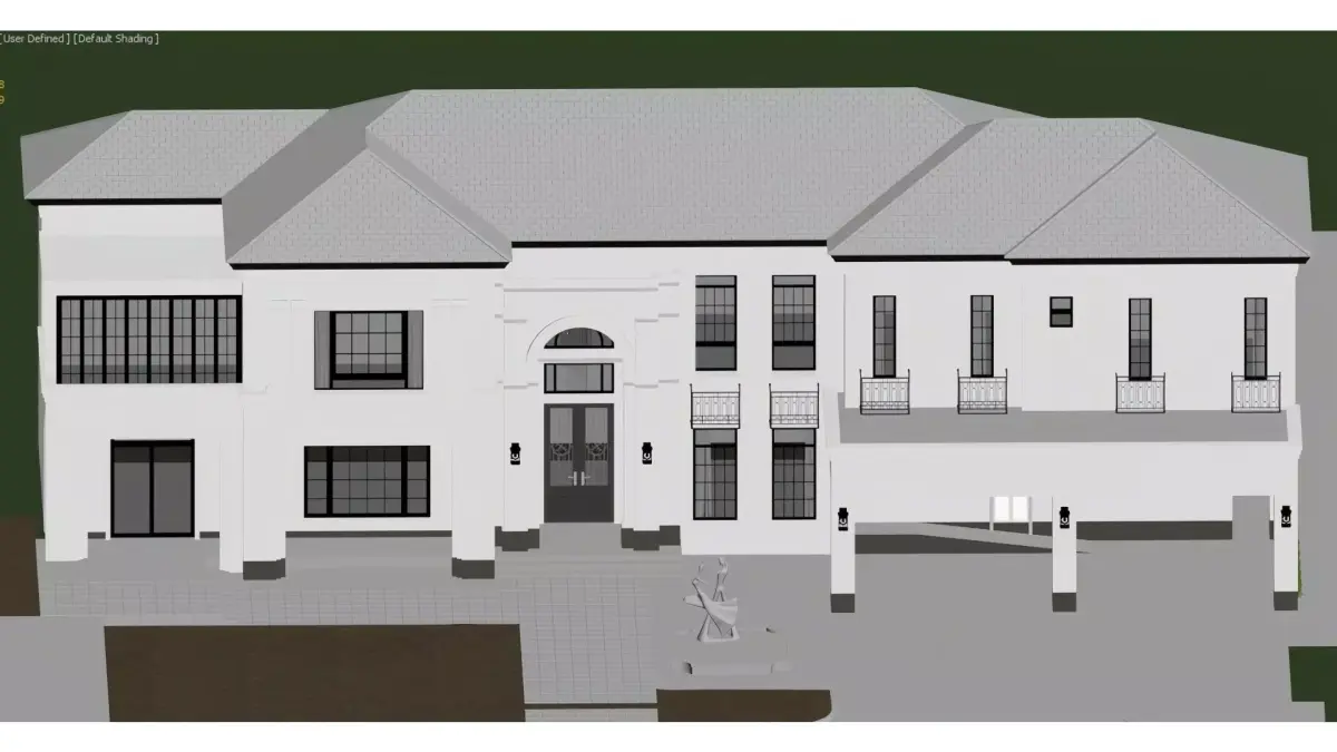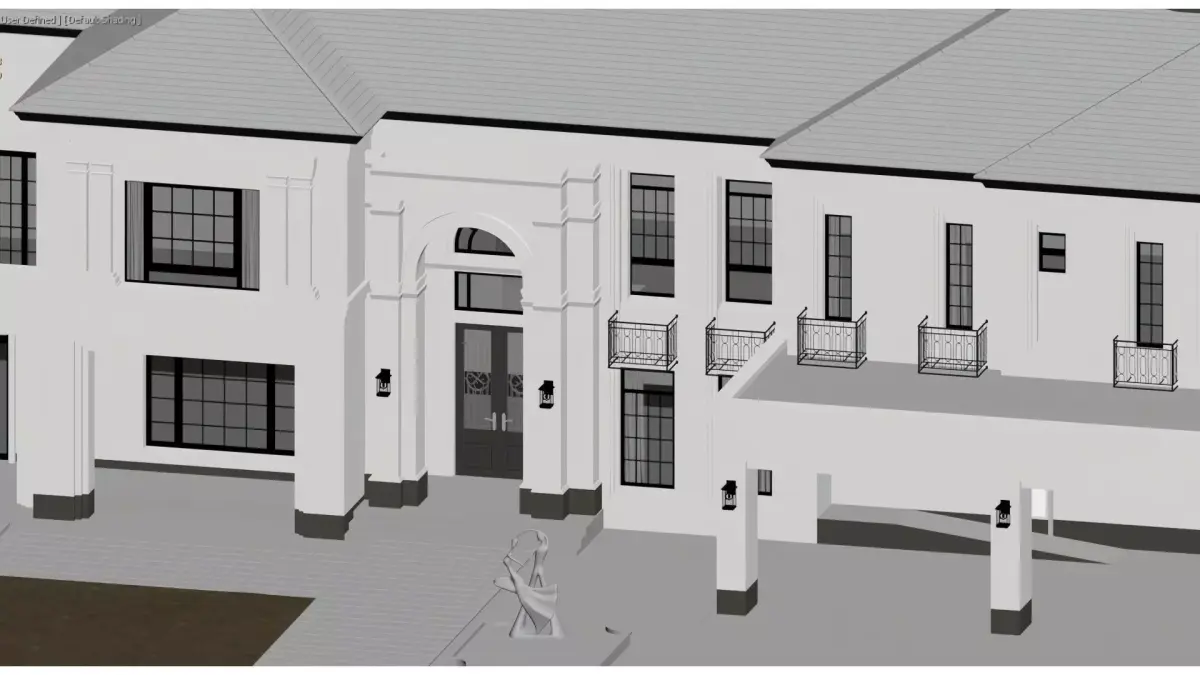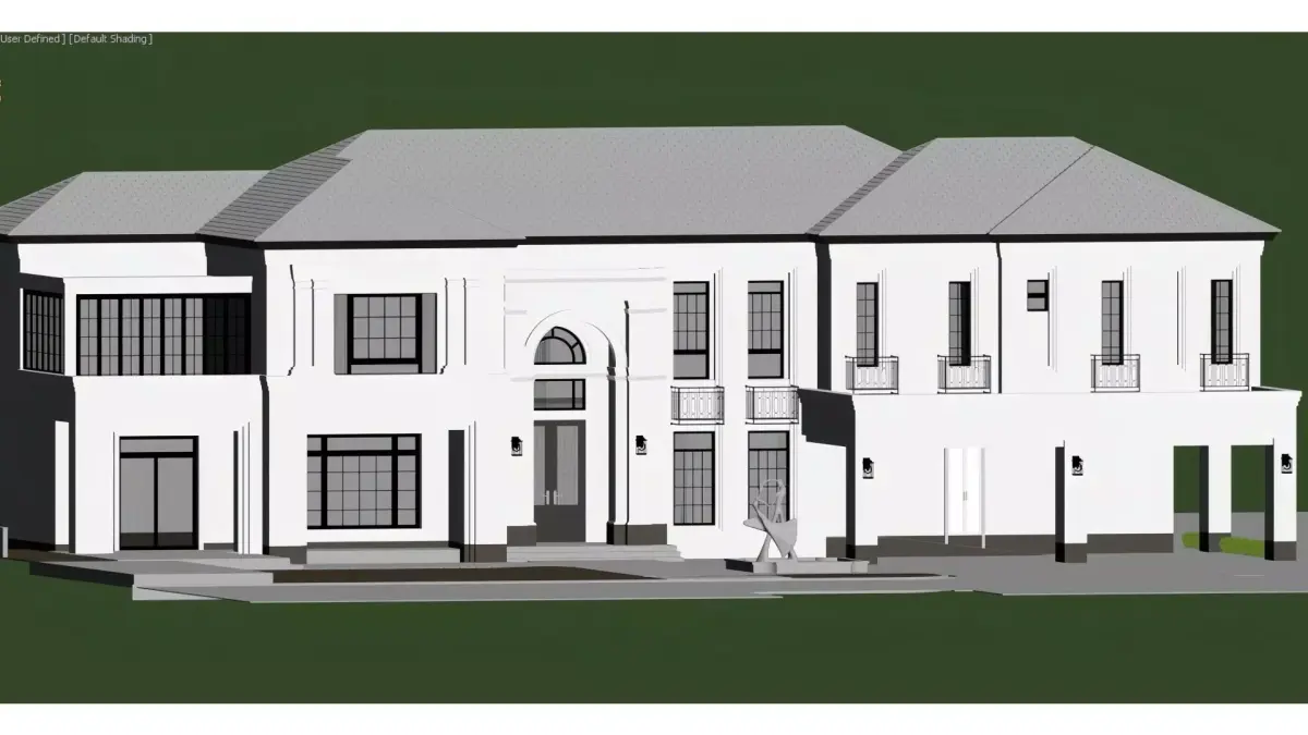 This is a two-story single-family villa in a modern French light luxury style, featuring a pure white exterior and a dark gray pitched roof, creating an elegant and imposing visual effect. The building adopts a classic symmetrical layout, with a central arched entryway adorned with exquisite wrought-iron door details. Large floor-to-ceiling windows and balconies line both sides, and the balcony railings are designed with simple metal lines, ensuring ample natural light while exuding a high-end texture.The front courtyard is meticulously planned, with neatly trimmed shrubs, lawns, and an art sculpture creating a serene and refined outdoor space. An open private garage on the right side balances practicality and aesthetic appeal. The overall design seamlessly blends the solemnity of European classicism with the sophistication of modern minimalism, making it a premium residential masterpiece that combines comfort with artistic value.