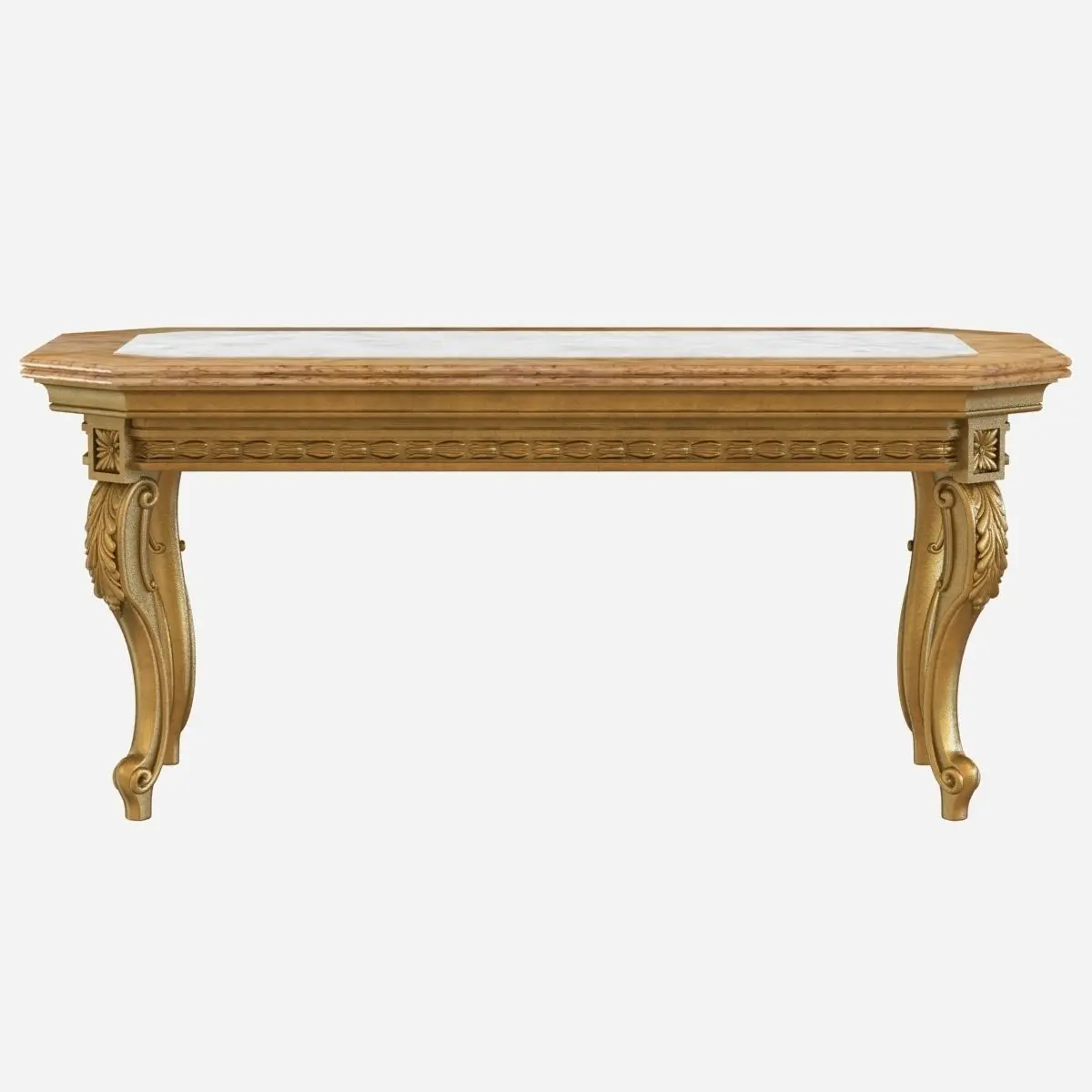 A very attractive French 19th century Transitional st. giltwood and marble coffee table. The coffee table is raised by elegant scrolled cabriole legs with finely carved acanthus leaves. The straight frieze displays a richly carved recessed berried laurel band with block rosettes at each cut corner. Above is the rectangular white Carrara marble top framed within a beautiful Brocatelle d'Espagne marble border with cut corners. All original gilt.