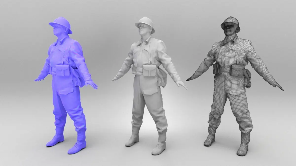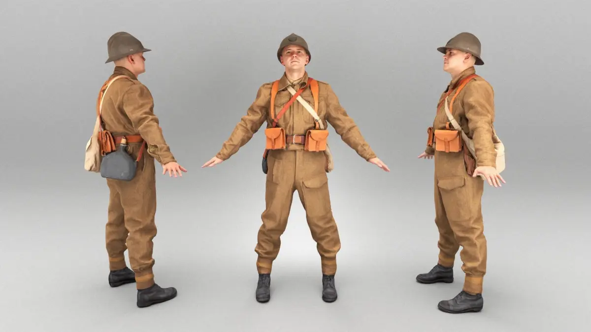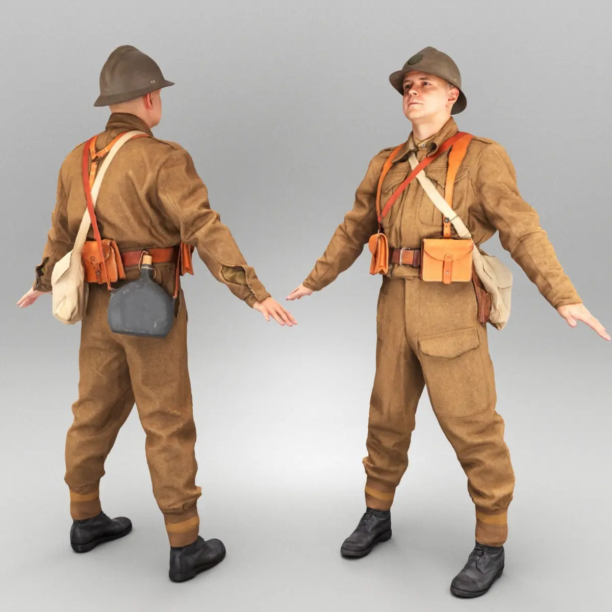 This is a true human size and detailed model of a French infantry character from 1940s. All props and suit are original. The model is captured in the A-pose with mesh ready for rigging and animation in all most usable 3d software.