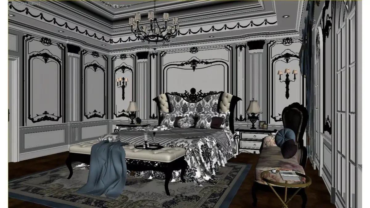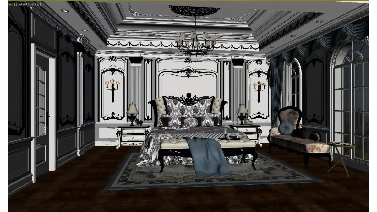 This is a master bedroom exuding the opulence of French court style. Taking cream white and light gray as the overall base, it is complemented by a wealth of gold-carved wall panels and decorative moldings, creating an elegant and magnificent visual effect.In the center stands a large upholstered bed adorned with intricate golden carvings. On both sides, matching nightstands and wall lamps are arranged symmetrically. A dazzling crystal chandelier hangs from the ceiling, perfectly complementing the golden relief decorations on it.The floor features artistic parquet wood flooring, with a blue-and-white patterned carpet laid in the middle, and a bench of the same style placed at the foot of the bed. By the window on the right, there is a chaise lounge with floral patterns, paired with dark velvet curtains and large arched windows. This not only ensures ample natural light but also adds a classical charm to the space.The entire space boasts exquisite details and rich layers, perfectly interpreting the design aesthetics of classic light luxury, and combining stunning visual impact with a comfortable living experience.