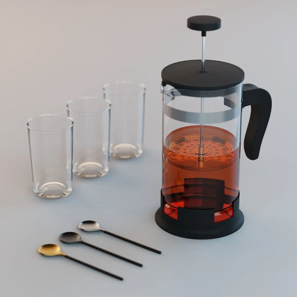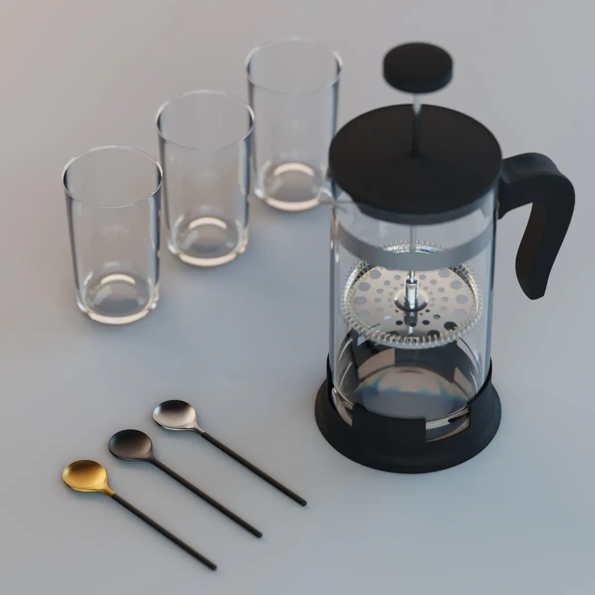 French press IKEA Upphetta with accessories - glasses and spoons.Model made in Blender 4.0 CyclesNative file includes the background, cameras, lights.Elements grouped in collections. French press pot parent to the glass element.Extra set of low poly elements.BLENDER USERS - For the best glass results - use light passes for glossy and transmission at 12.