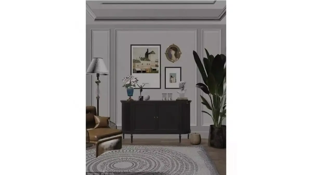 This is a living room corner brimming with French retro charm. Light gray walls are paired with exquisite plaster moldings, creating an elegant sense of spatial hierarchy. The black retro side cabinet is adorned with artistic sculptures, floral arrangements, and candlesticks. Scattered on the wall are artistic paintings of landscapes and figures, whose golden oval frames enhance the retro texture. Next to it, a brown leather armchair is matched with a retro floor lamp, while a circular patterned carpet on the floor enriches the visual experience. The combination of large green plants and a plaster statue of David infuses the entire corner with an artistic vibe amid its retro style, fully embodying the exquisite and elegant French home aesthetics.
