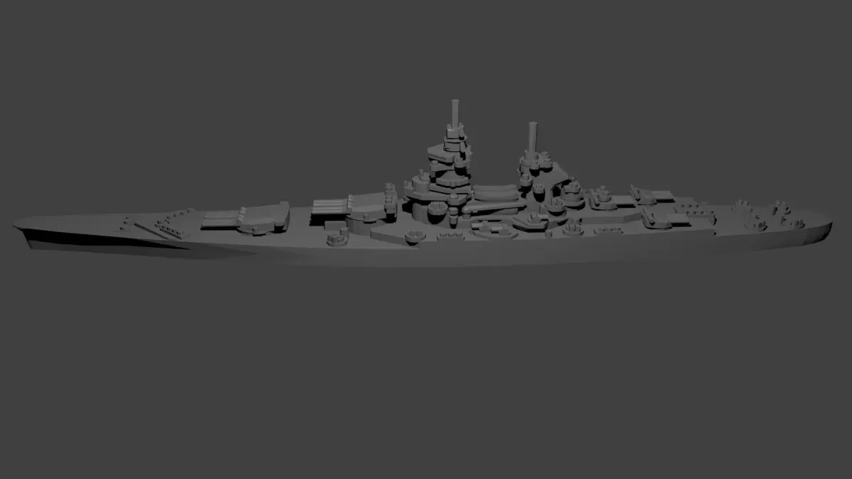 This model is designed and tested at 1/1800th scale, but up-scaling and down-scaling are possible. Since the model is optimized for 1/1800th scale, it is not ideal to print larger versions due to a lack of detail. The gun barrels and mast have been enlarged.