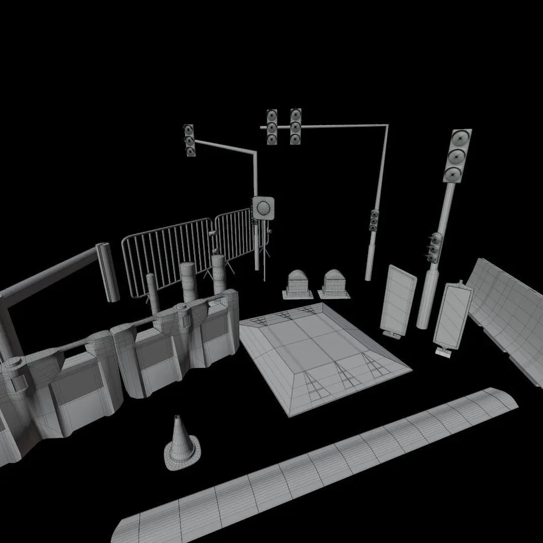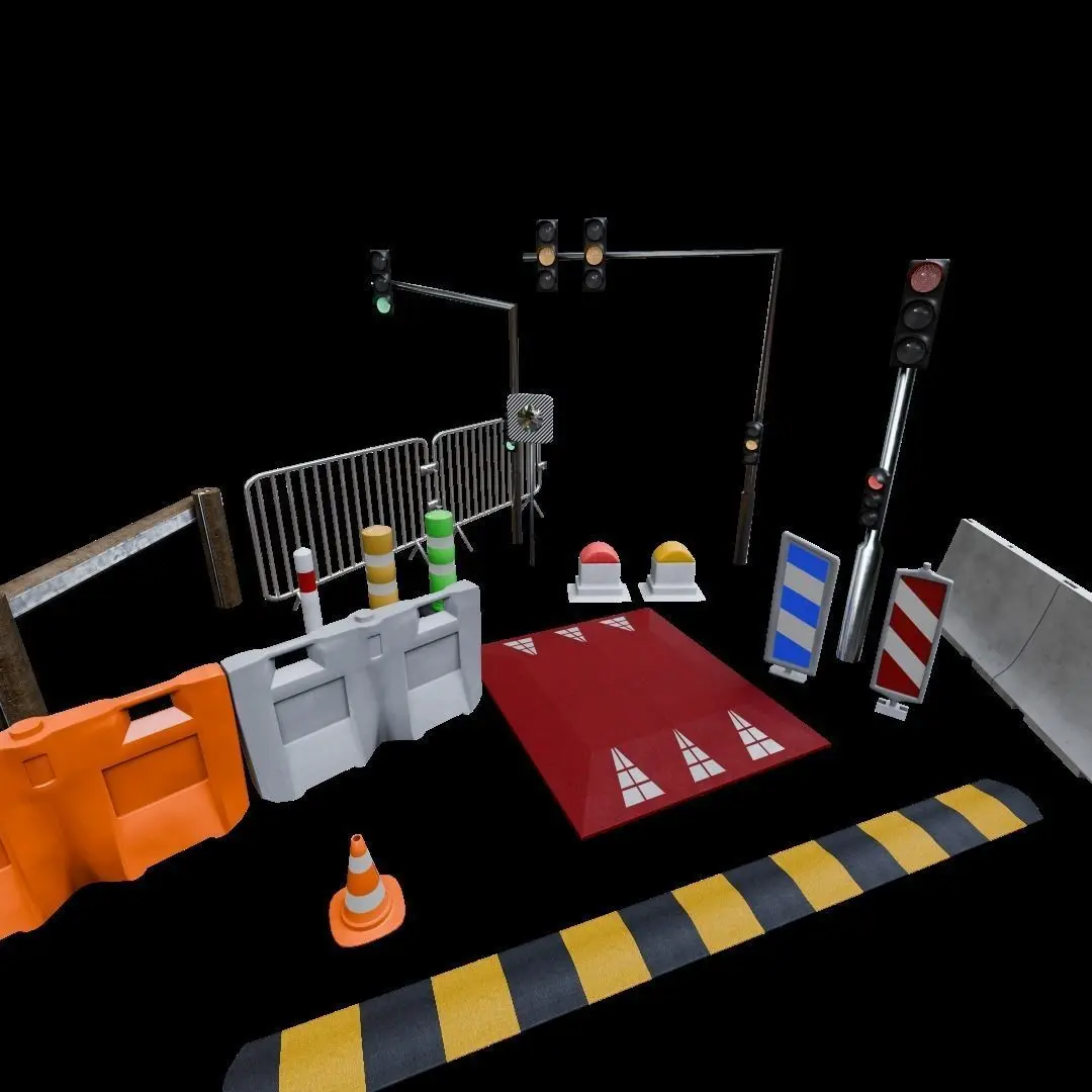 This comprehensive French road traffic signs props pack PBR 2k is perfect for your 3D visualization, animation, and game projects. It includes a wide range of detailed and ready-to-use objects, such as double and single traffic lights, bollards with and without reflective strips, bornes, plots, separators, speed bumps, barriers, guardrails, and mirrors.