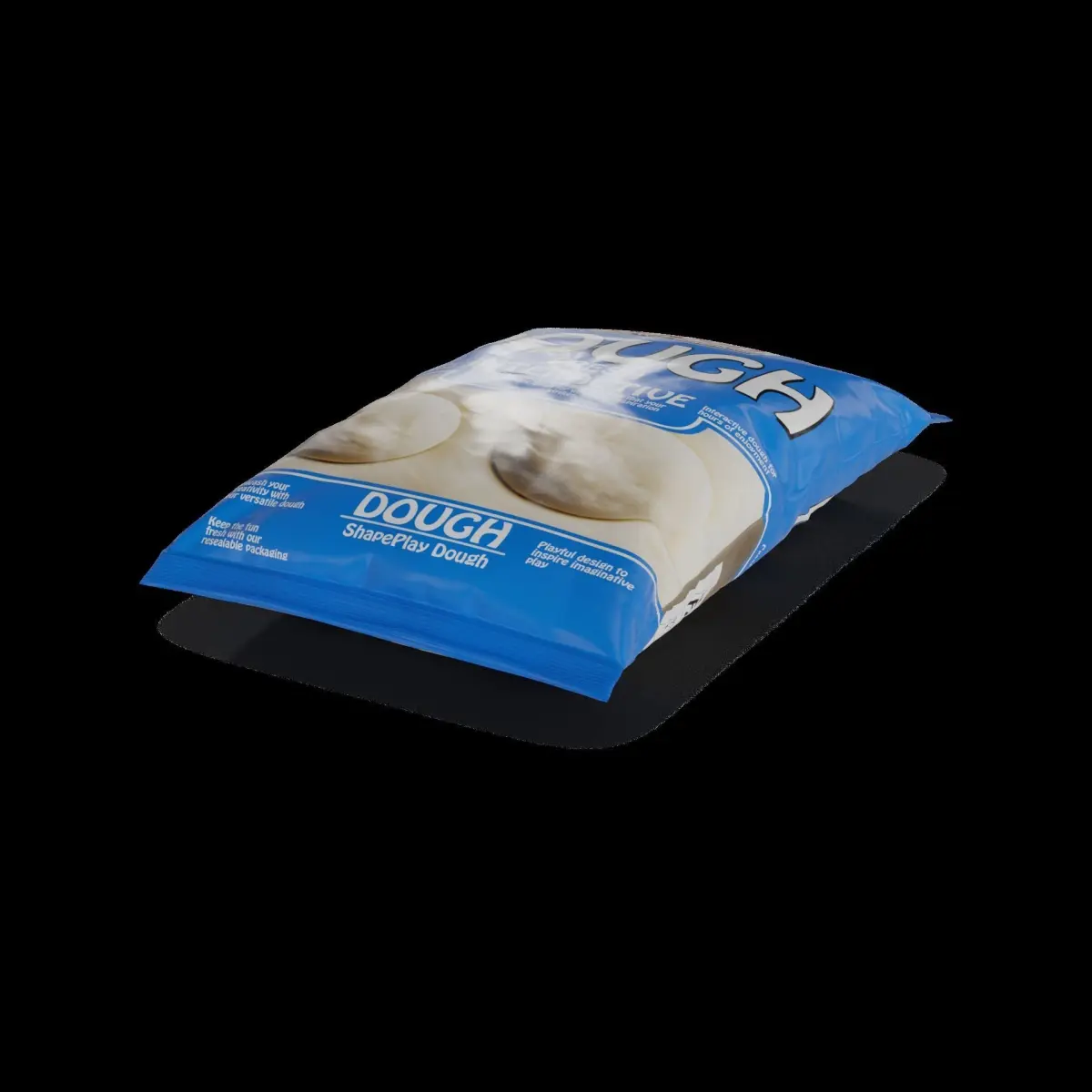 Dough: Let your imagination run wild with this versatile dough. The packaging is a resealable, silver foil bag, ensuring the freshness of the dough. The label on the packaging features a playful design, with the text Dough in colorful, bubble font, along with a graphic of a rolling pin and various shapes that can be made with the dough.