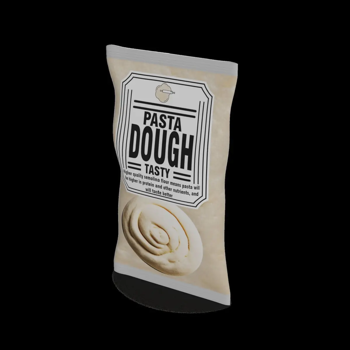 Dough: Get creative in the kitchen with this versatile dough. The packaging is a resealable plastic bag, ensuring the freshness of the dough. The bag is labeled with a simple yet stylish design, featuring the text Dough in a playful font, along with a graphic of a rolling pin and various shapes that can be made with the dough.