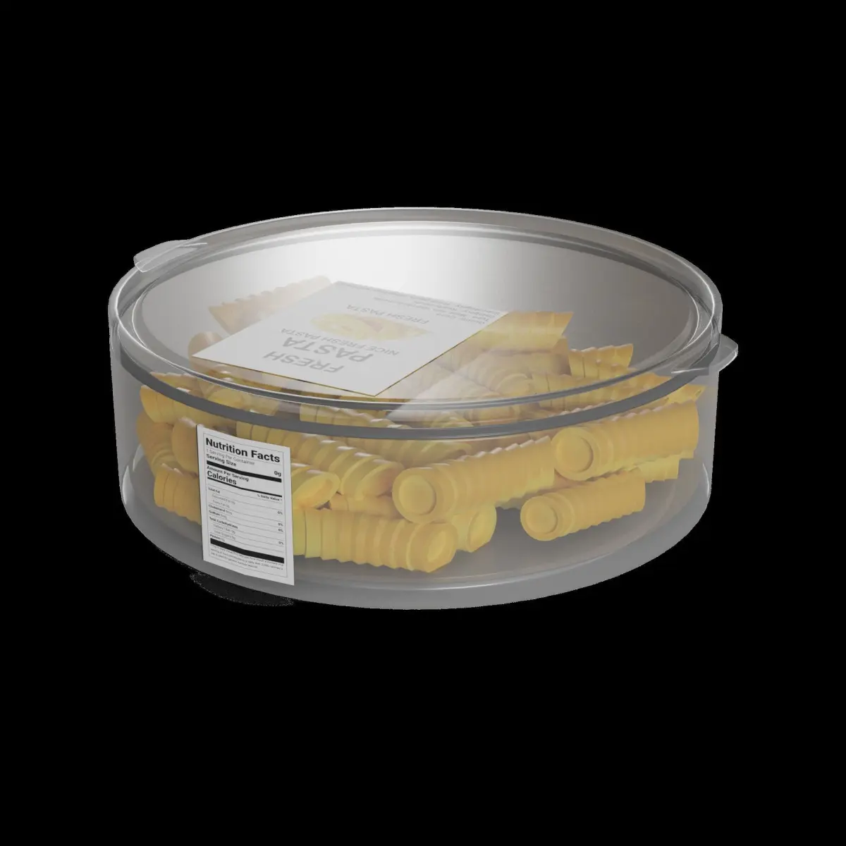 Fresh Pasta: A delicious pack of fresh pasta, perfect for a quick and easy meal. The packaging is a transparent plastic container, allowing you to see the vibrant yellow color of the pasta inside. The label on the packaging features a mouthwatering image of cooked pasta, along with the text Fresh Pasta in bold, inviting font.