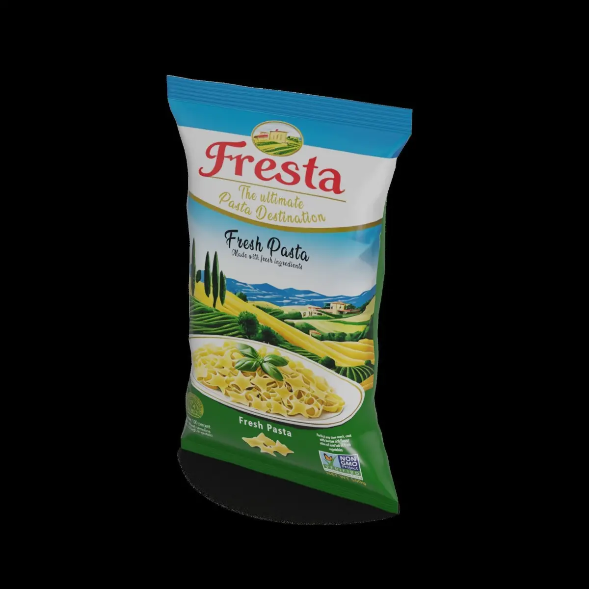 Fresh Pasta: Experience the taste of Italy with this fresh pasta. The packaging is a clear, plastic bag, allowing you to see the vibrant green color of the pasta inside. The label on the packaging features a picturesque image of an Italian countryside, along with the text Fresh Pasta in elegant, script font.