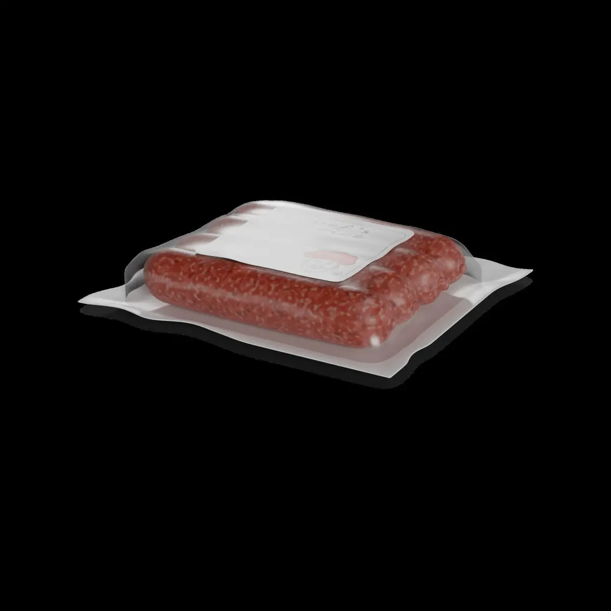 Fresh Sausages: Delight your taste buds with our handcrafted fresh sausages. Packaged in a clear, resealable bag, these sausages are easy to store and cook. The packaging design showcases a vibrant color palette, with a playful illustration of a chef's hat and the text Chef's Choice to highlight the culinary expertise behind our product.