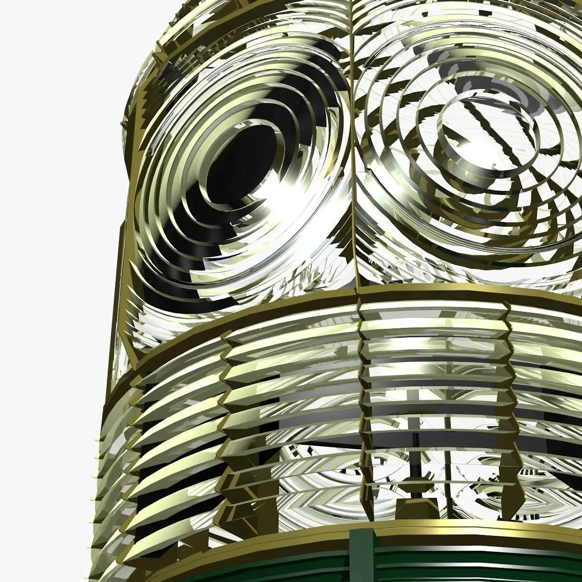 Three kind of lights are used for the Lantern to have a faithfull result:- a ball object, positioned in the system focus, emitting in all directions through an emit material, useful to obtain mutual reflections inside the prism in daylight scenes,- an internal screen object limited by side screens lit, again, through an emit material, but in frontwise direction only, useful to have the lens system and prisms lit when looking to fhe lantern in night scenes,- one or a system of parallelely oriented volumetric spot lights representing the rotating beam, necessary also to lit far objects passing in front of the lighthouse. The Lighthouse Tower shown in one of the Turntables is not supplied: it has been added from an other model of ours, sold under the name of Cape Aghulas Lighthouse.