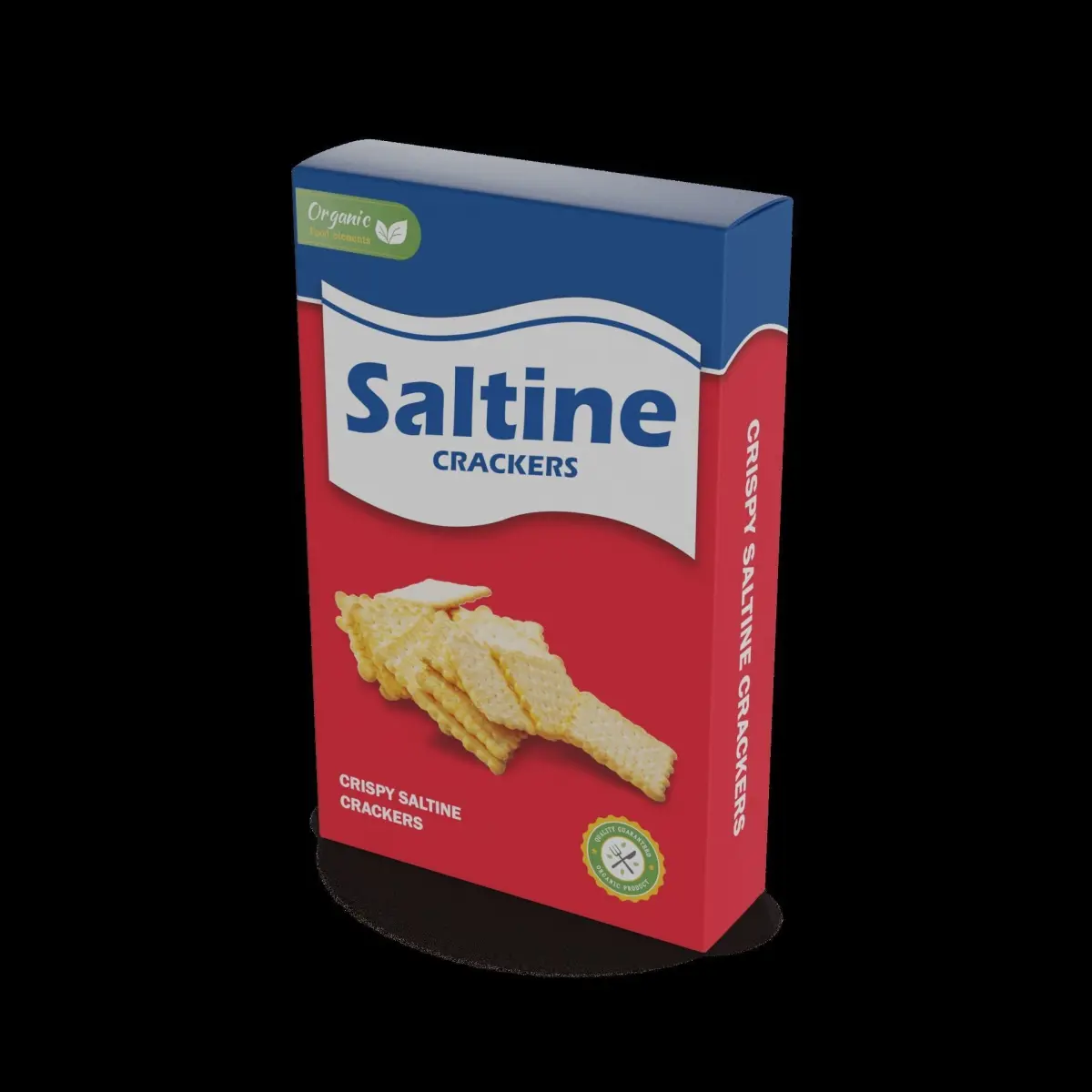 Saltine Crackers: A red box filled with crispy saltine crackers. The packaging features a graphic of a stack of crackers and the words Saltine Crackers in bold, white font. The crackers are light and flaky, with a hint of salt that makes them a versatile snack for any occasion.
