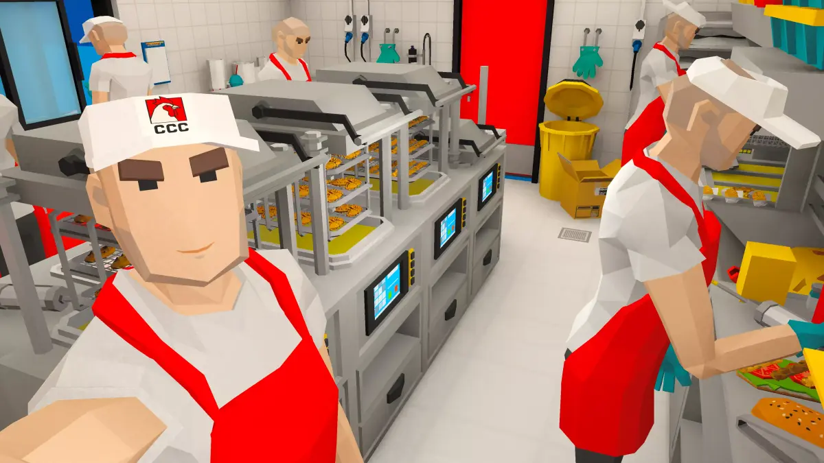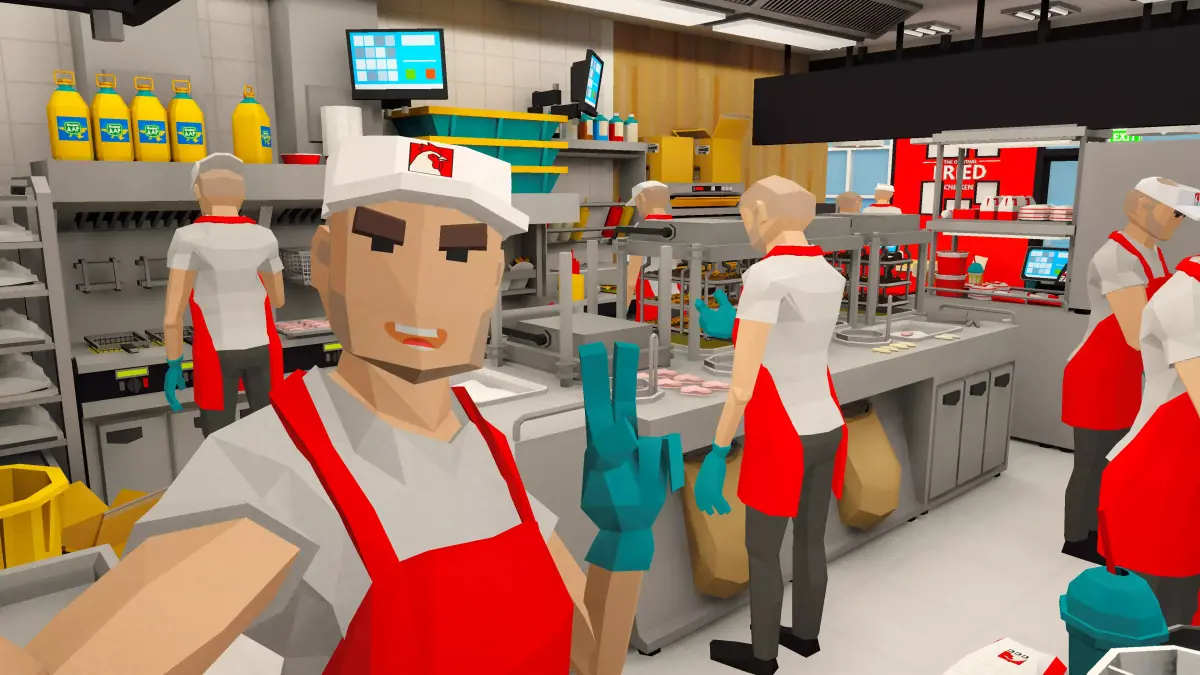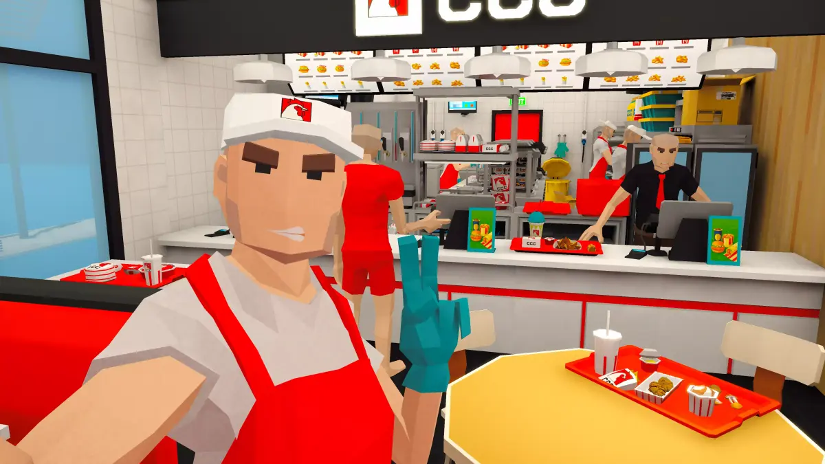 Propsnapkin, spoon, poster (x2), self-service cash register, round table, chair, tray grill, metal tray, fire alarm, ceiling lamp, menu (x2), monitor, exit, gloves, kitchen tray, roller cabinet, deep fryer, table with cups, soda dispenser, sauce pipette, potato cupboard, kitchen table, dough container, metal chicken basket, chicken fryer, refrigerator, trash can, cable, air conditioner, drain, tongs, tablet, potato scoop, mini fridge, salt shaker, serving table, tabletop sign, flat ceiling lamp, box (X2), tray bin, toilet cubicle, toilet, washbasin, soap, toilet urn, bag, wc, dispenser gun, spice, temperature maintenance chamber, table, corner sofa, container, oil, dish shower