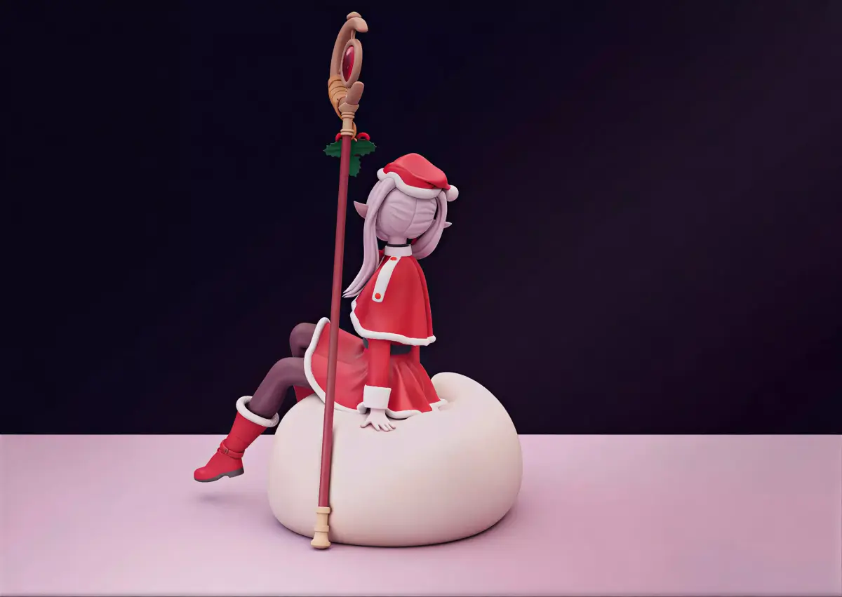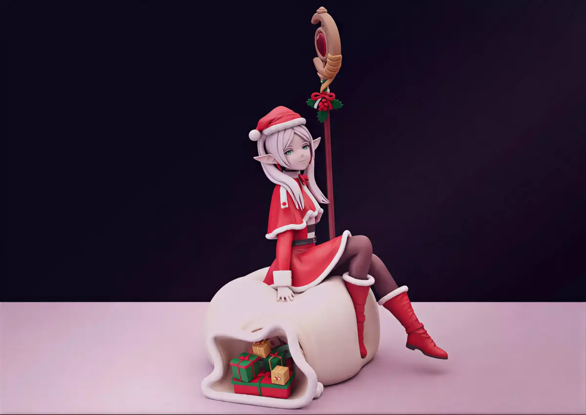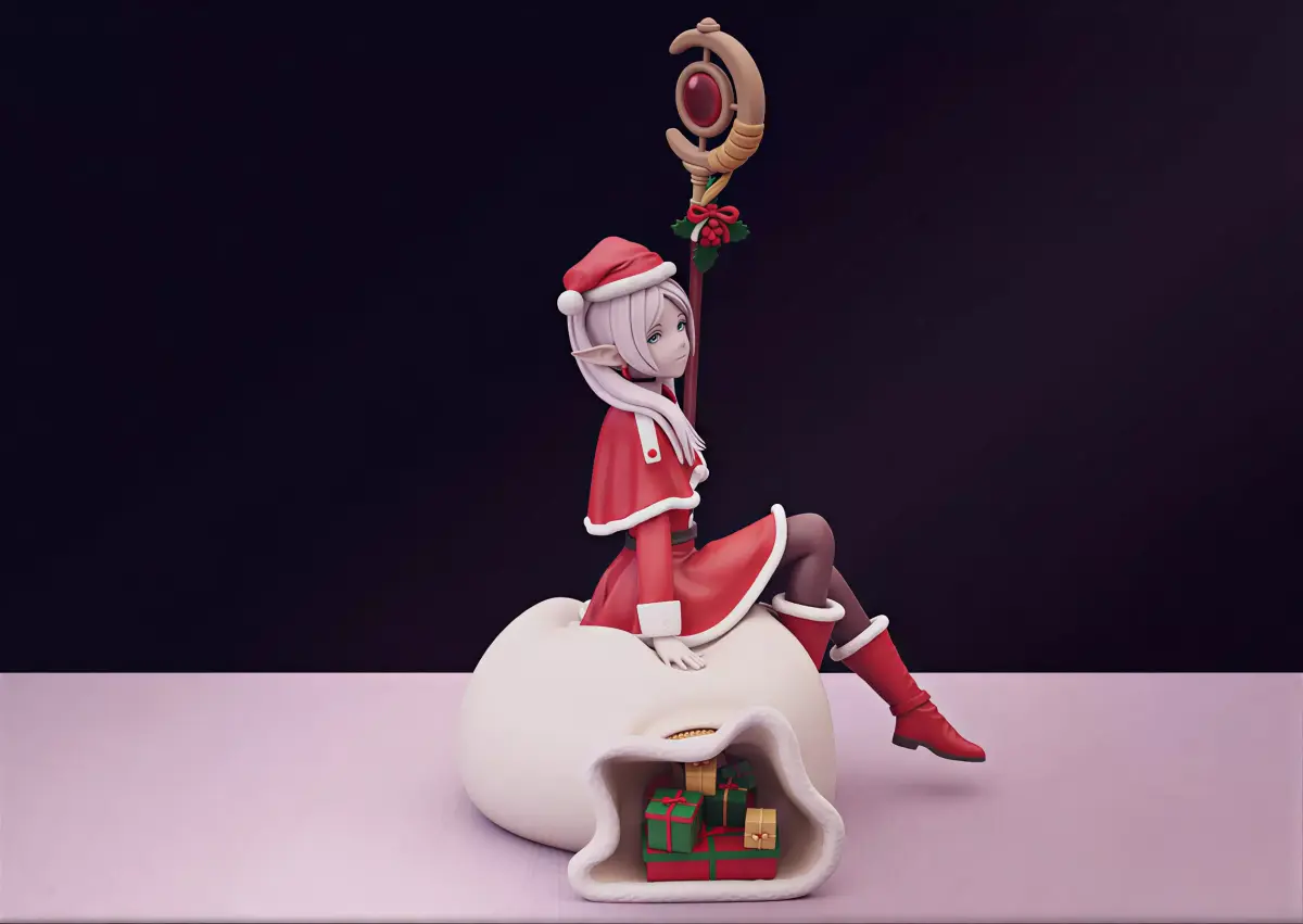 This elegant Frieren 3D print model presents the beloved anime character in a graceful, Christmas-themed design. Frieren is depicted seated calmly atop a festive sack filled with gifts, wearing a seasonal red outfit with soft fur trims and a Santa-style hat. Her relaxed pose, gentle expression, and signature elven features capture her quiet personality while adding a warm holiday atmosphere.