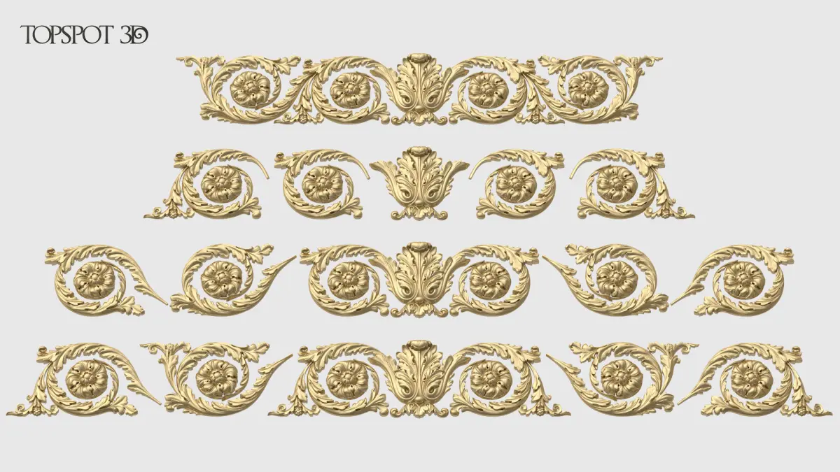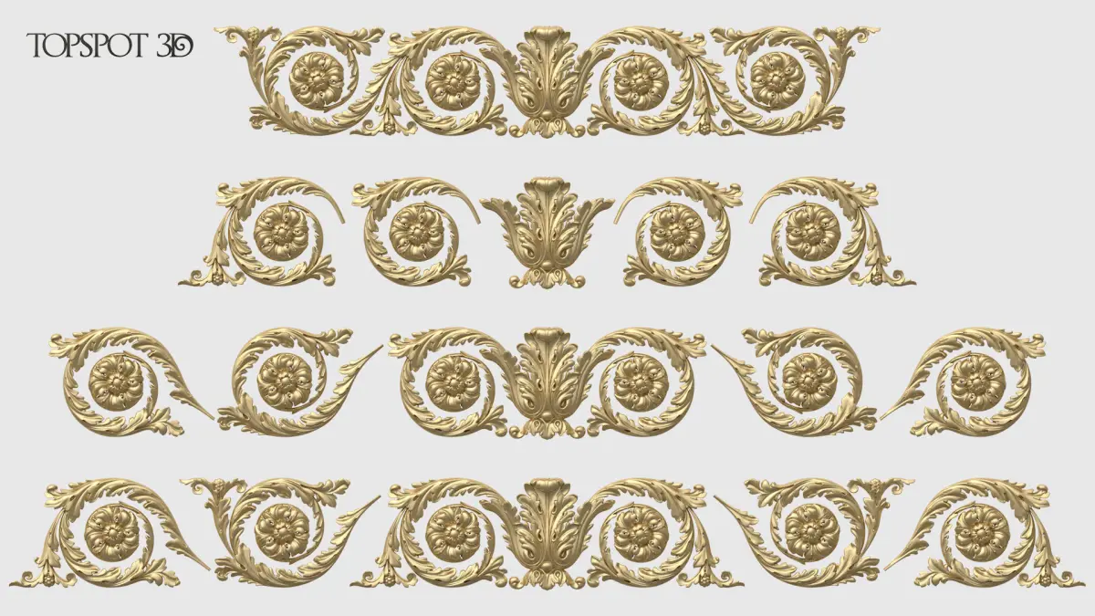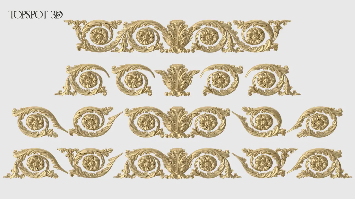 The set consists of acanthus scrolls, which can be composed into friezes of any length. The frieze is developed from the center by mirrored models. The set includes 16 models