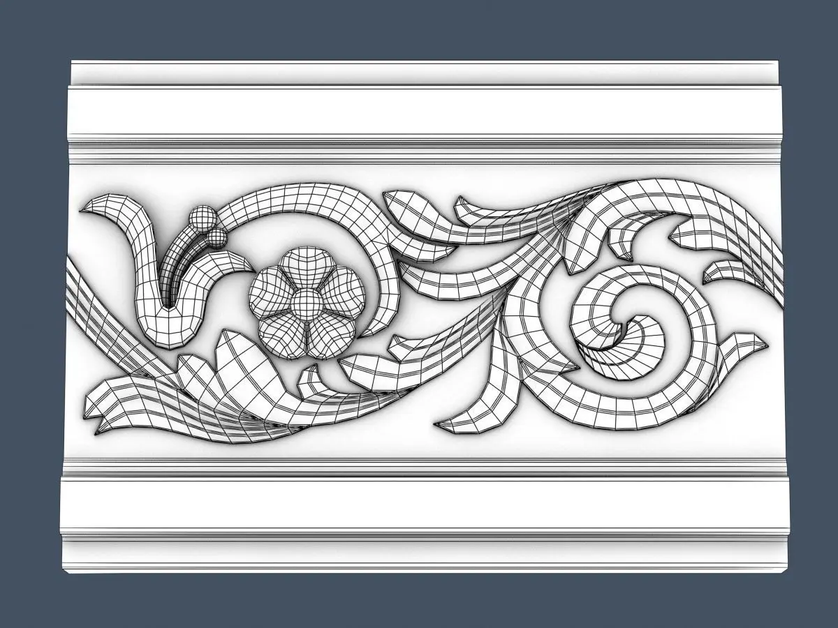 Model consists of 3 modular pieces; a center ,inner and outer corner that can be seamlessly combined. Module size can be seen in the wireframe images.Naming convention used is: Frieze_### where ### stands for straight/inner/outer.Polygon count shown in the 3D model specification section is the sum of all 3 modules.Model contains only tris and quads, with good clean topology.Model is 10cm (3.9 inches) in height.Topology is set up so that model can be used without subdividing/smoothing as a background element.In case the model is to be used as the center piece of your render it can be subdivided/smoothed without any changes in its silhouette.