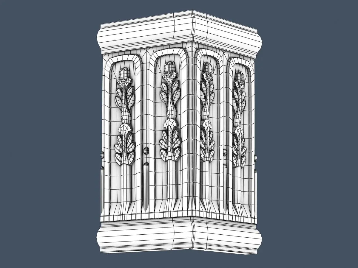 Model consists of 3 modular pieces; a center ,inner and outer corner that can be seamlessly combined. Module size can be seen in the wireframe images.Naming convention used is: Frieze_### where ### stands for straight/inner/outer.Polygon count shown in the 3D model specification section is the sum of all 3 modules.Model contains only tris and quads, with good clean topology.Model is 10cm (3.9 inches) in height.Topology is set up so that model can be used without subdividing/smoothing as a background element.In case the model is to be used as the center piece of your render it can be subdivided/smoothed without any changes in its silhouette.