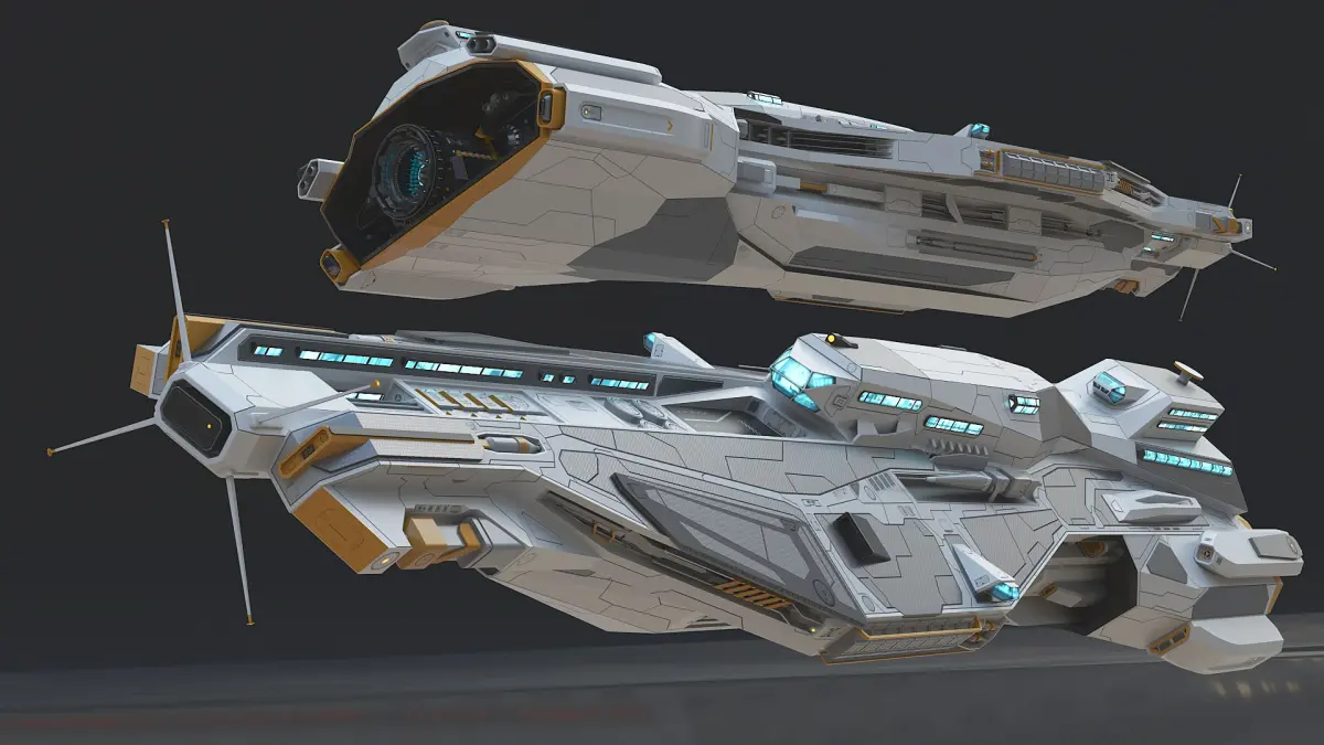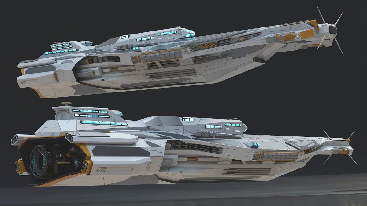 This highly detailed model features sleek, aerodynamic architecture with intricate components, including a robust propulsion system and advanced technology panels. The design incorporates multiple thrusters, antenna arrays, and sophisticated docking stations, providing realism and authenticity. The vessel's hull is accented with metallic tones and illuminated elements, adding to its cutting-edge aesthetic.