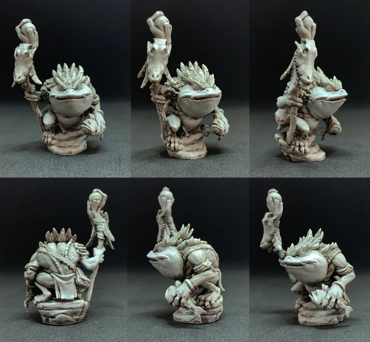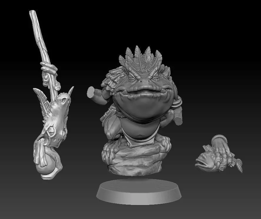 A swampdwelling frogshaman. Designed to be printed and used in tabletop wargames. The object files are highpoly and files are separated into base, body, staff and fish hand.He will require assembly after printing.