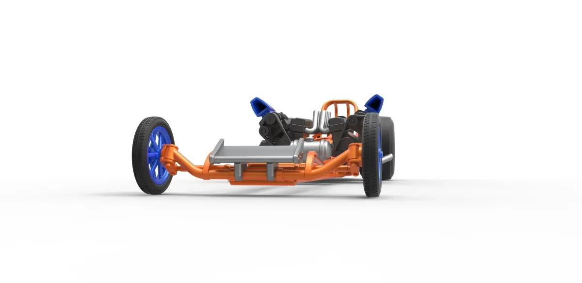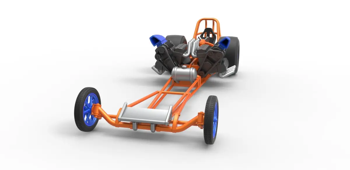 The model consists of parts: Air intakes, Body part 1,2, Engines, Front rims, Front spoiler, Front tires, Left exhaust pipes, Rear rims, Rear tires, Right exhaust pipes, Seat, Shifter, Steering wheel, Tank.