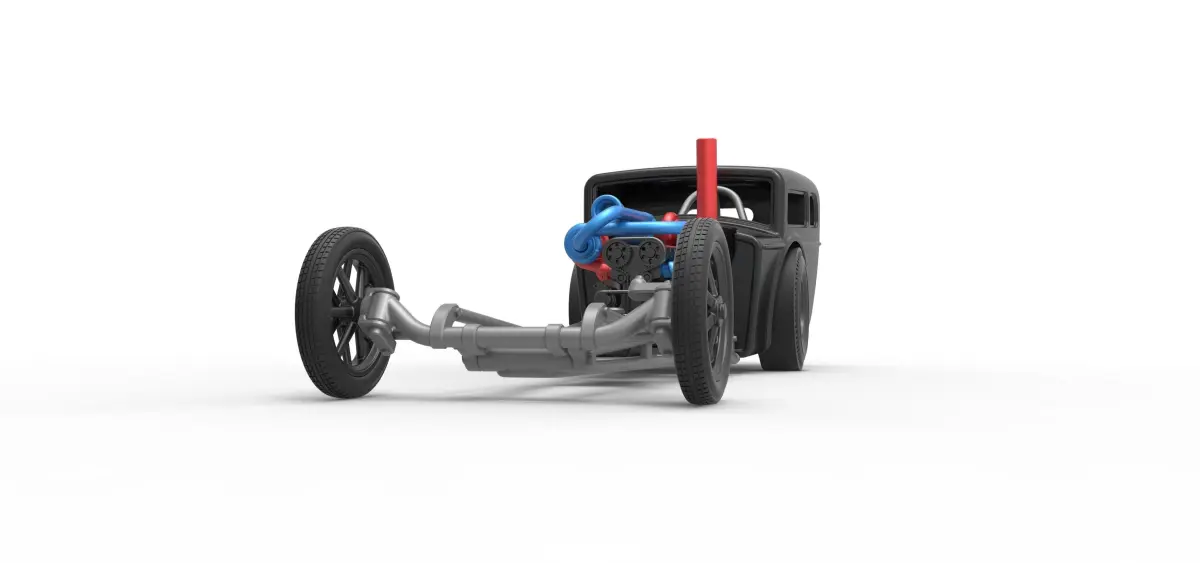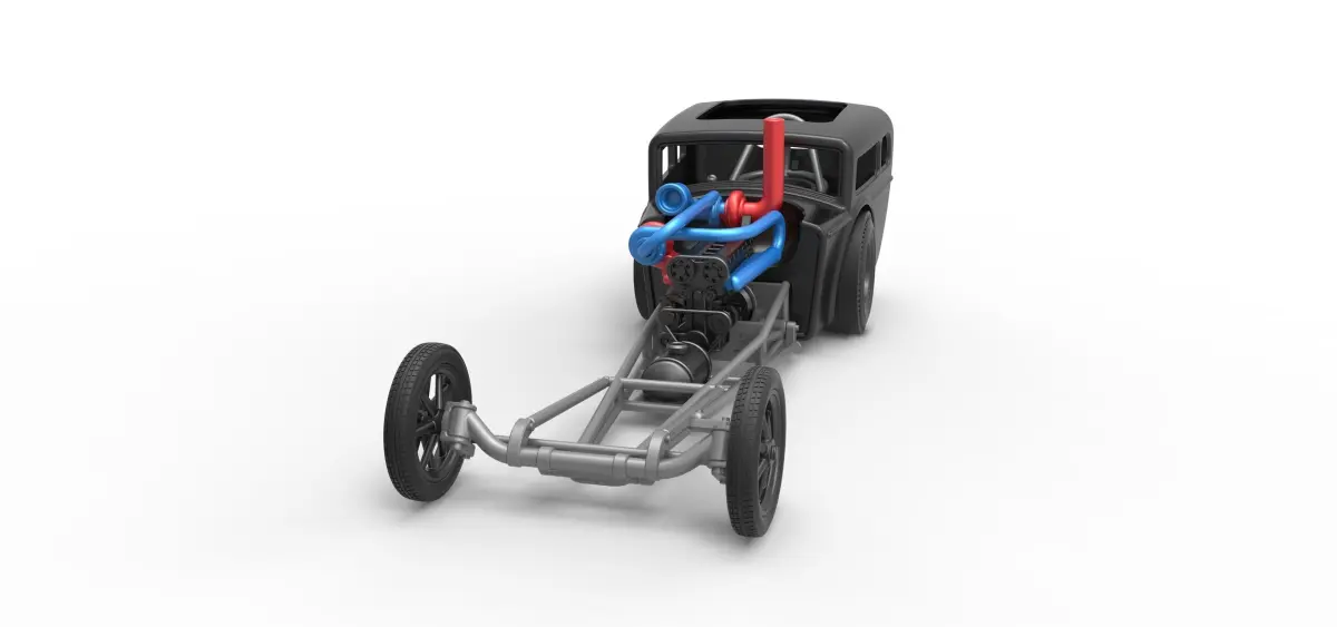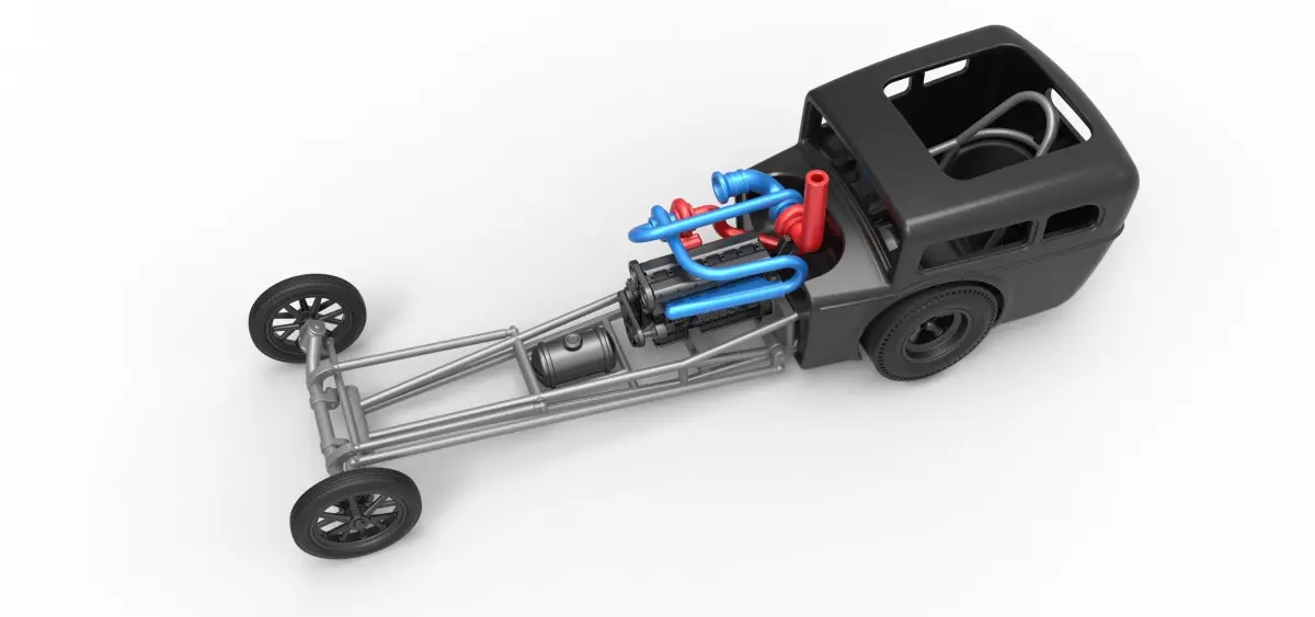 The model consists of parts: Body, Compressor part 1,2, Engine main part, Exhaust part 1,2, Front rims, Front tires, Rear insert, Rear rims, Rear tires, Seat, Shell, Shifter, Steering wheel, Tank.