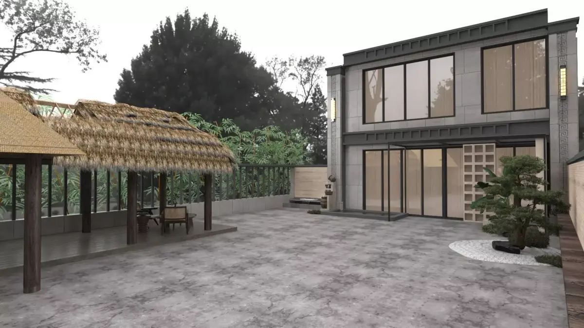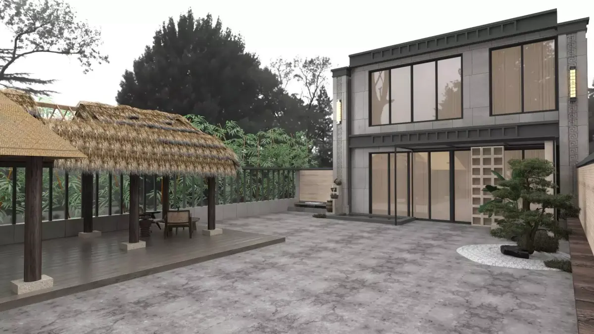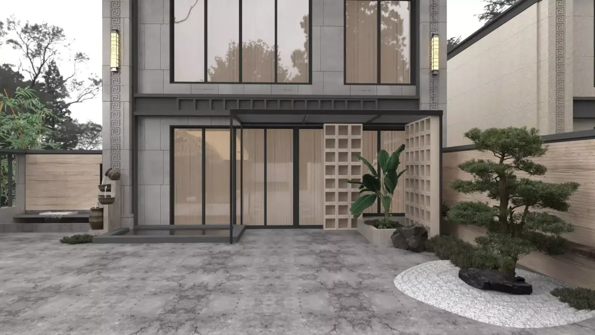 Front yard design. Various decorative items.All naming in English.
