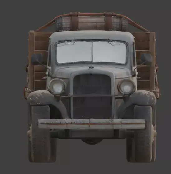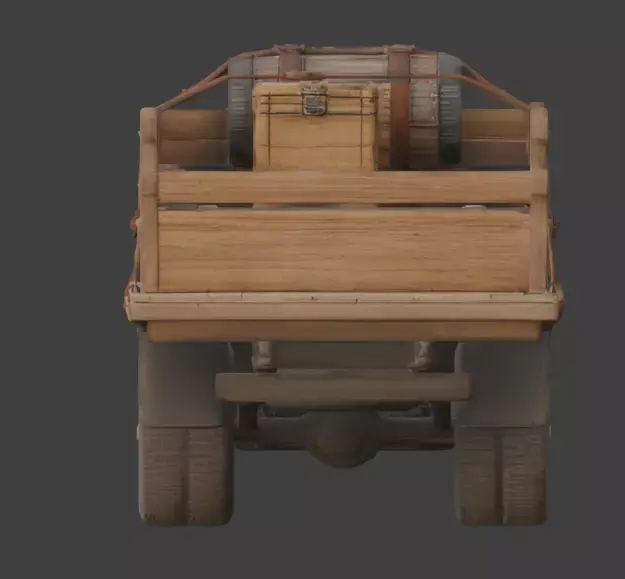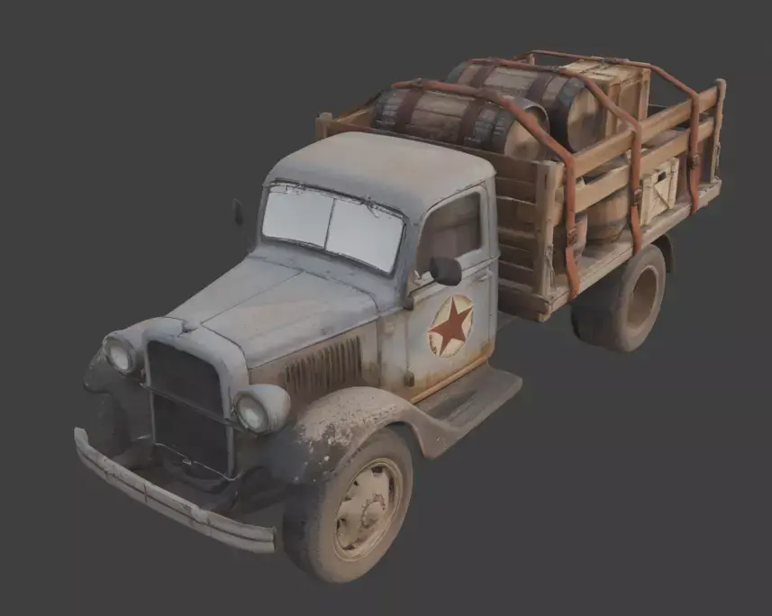 Cargo truck featuring a vintage cab design integrated with a high-capacity wooden slat cargo bed, perfectly capturing a Wild West or post-apocalyptic frontier aesthetic. The vehicle’s metal body is heavily weathered with realistic rust, dirt, and sun-faded paint, and features a prominent star emblem on the side door. The rear wooden bed is fully loaded with survival supplies, including multiple wooden barrels, crates, and storage trunks, all secured with detailed leather straps and metal buckles. Sitting on a dual-rear-axle chassis with treaded tires, this truck is designed for long-distance transport through harsh wasteland environments. This models is suitable for remesh and decimate.