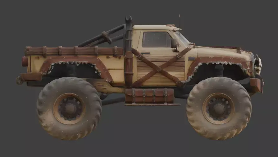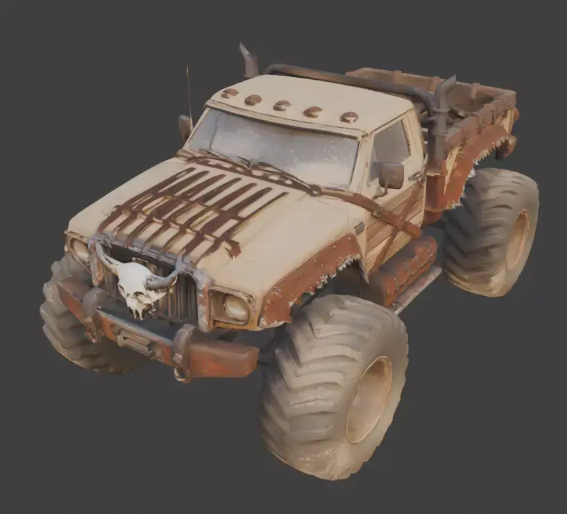 Monster truck featuring a heavily armored Wild West frontier aesthetic with post-apocalyptic modifications. The vehicle’s body is reinforced with wooden plank side panels and leather-trimmed wheel arches with jagged, tattered detailing. It is equipped with a prominent horned skull mounted to the front grille and a vertical, heat-wrapped exhaust stack behind the cab. The design includes side-mounted leather gear bags and a reinforced metal roll bar in the truck bed. Supported by a massive high-clearance suspension, it sits on four oversized, sand-dusted off-road tires with aggressive treads designed for desert wasteland navigation. This models is suitable for remesh and decimate.