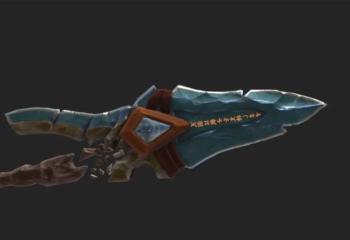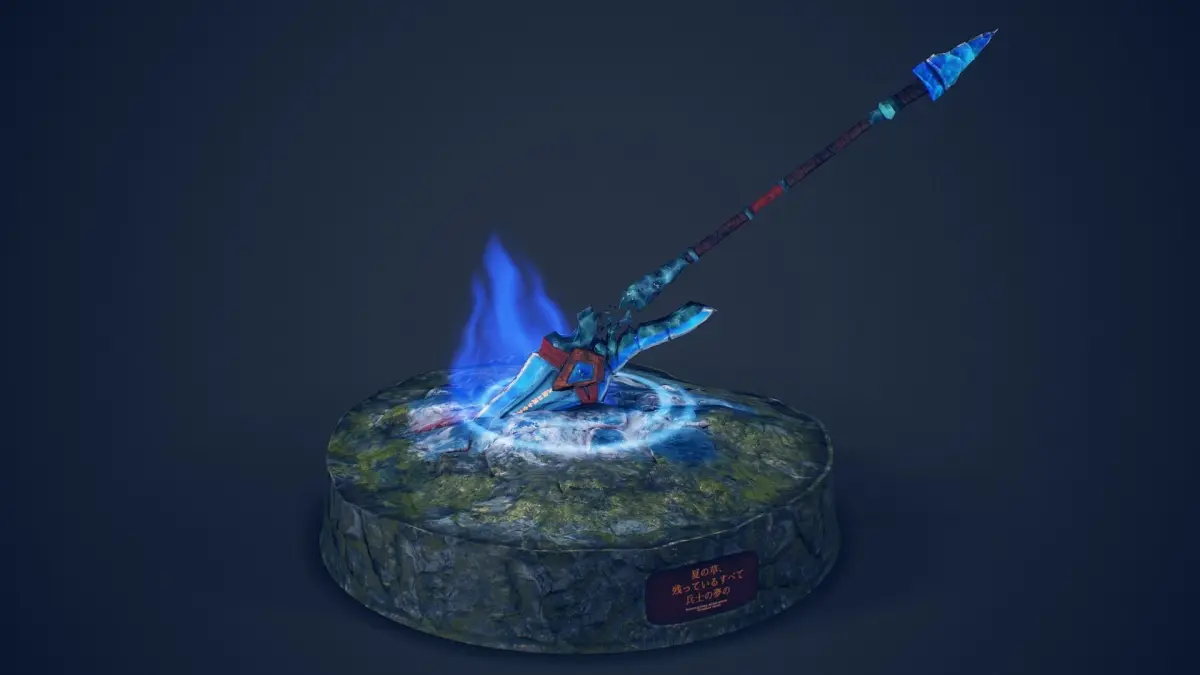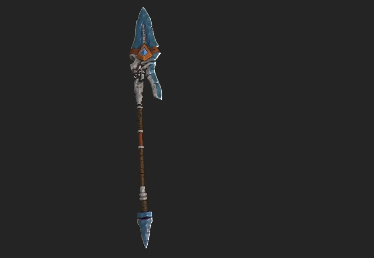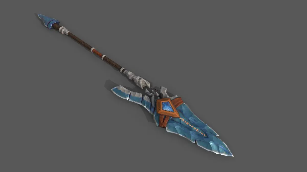 Ringtail Studio presents a game-ready, low-poly model of Cold Steel Arms - Frost Song Glaive Polearm. The asset (WoW-style weapon) is a wooden spear with a sharp stone spearhead decorated with gems and Chinese characters.