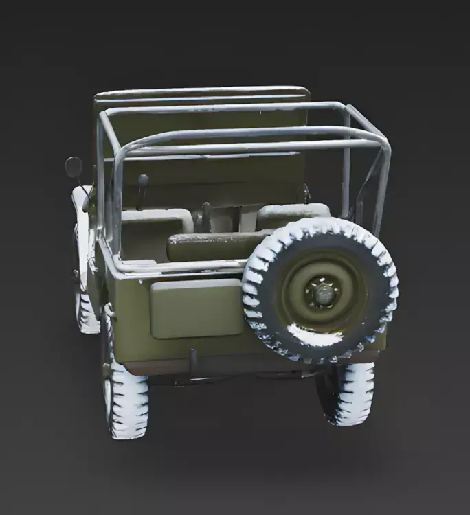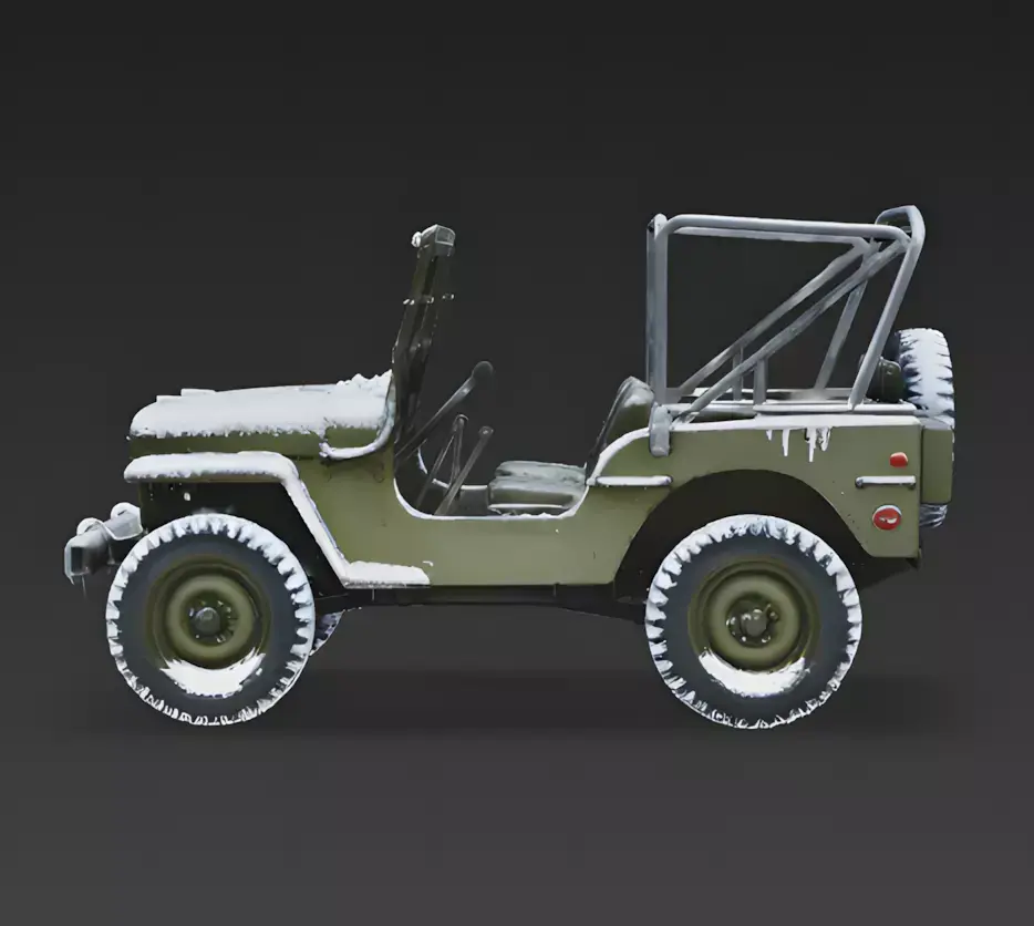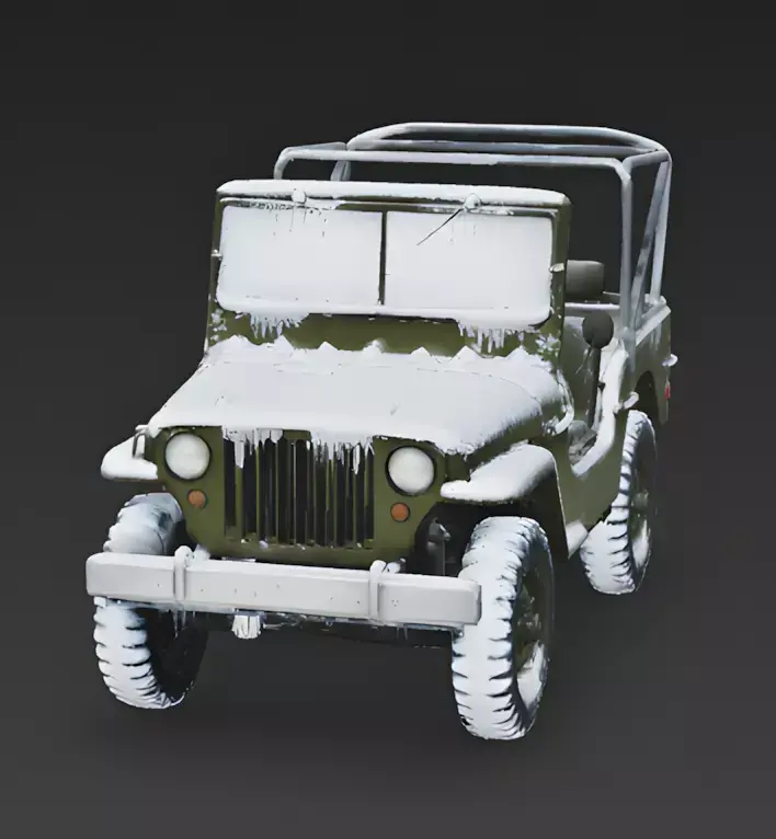 The Overall Concept This asset is a vintage military utility vehicle, designed in the style of a classic Willys Jeep. It is depicted in a completely frozen state, covered in snow and ice, making it perfect for winter war scenes or survival games.